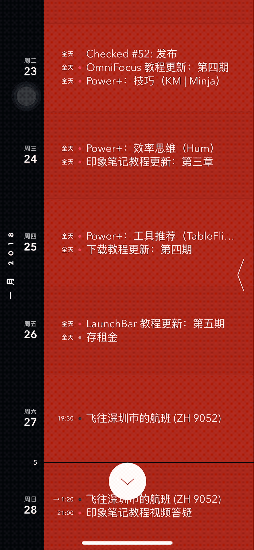 把周视图和列表视图的结合也让 Timepage 避免了列表视图的软肋——事件过于突出,导致日期分割不明显。在这些点上 Fantastical 是做得最不理想的: