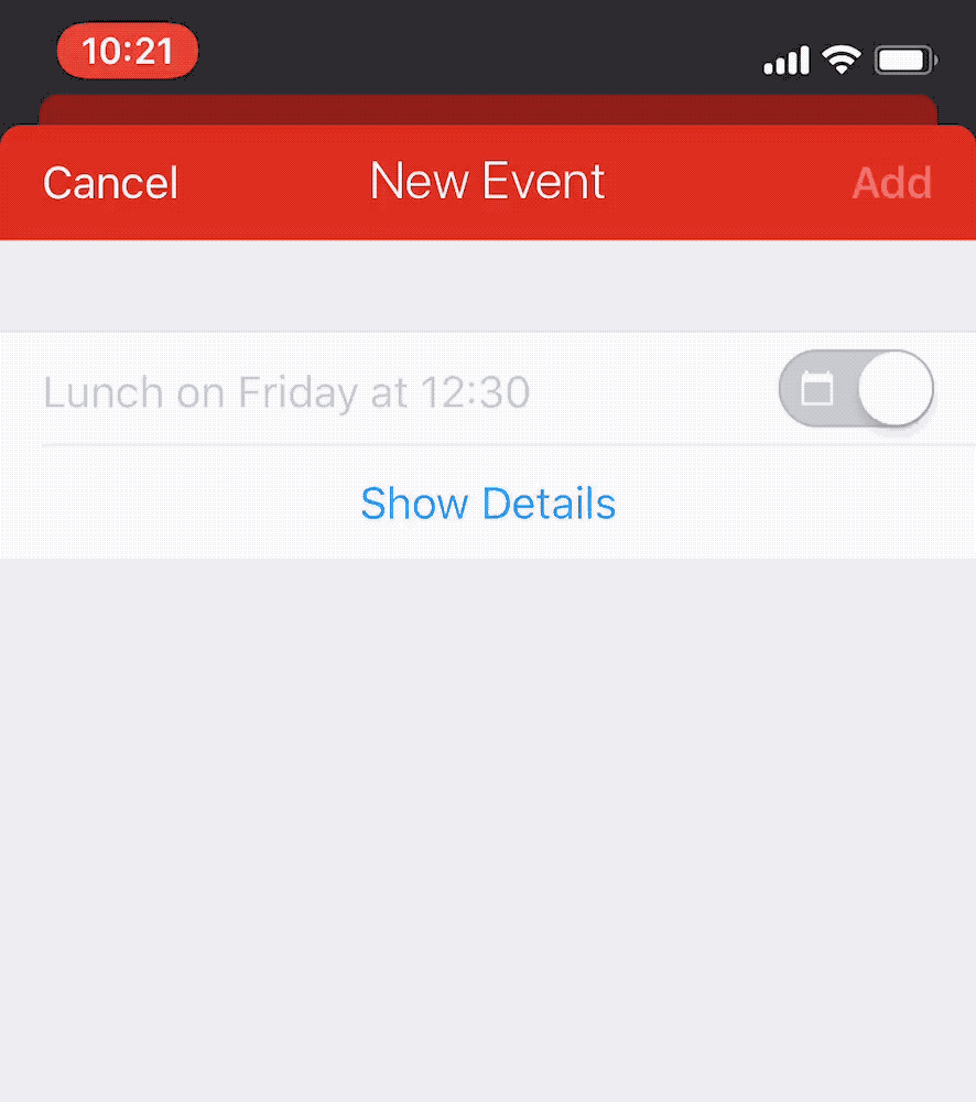 通过文本输入不光是一种神奇的体验,从效率上来看,它也要比通过图形界面来输入优势更大。比如输入日期 1 月 27 日 时,文本输入用 27/1 或者 1.27 就能解决,而图形界面需要通过一个日期的滚轮来选择,劲儿大了还容易滚过。在信息少的时候还不大能体会到两者的差别,但信息较多时——比如除了日期还要选择起始时间、截止时间,有 4 个滚轮要滚——就会很麻烦了。