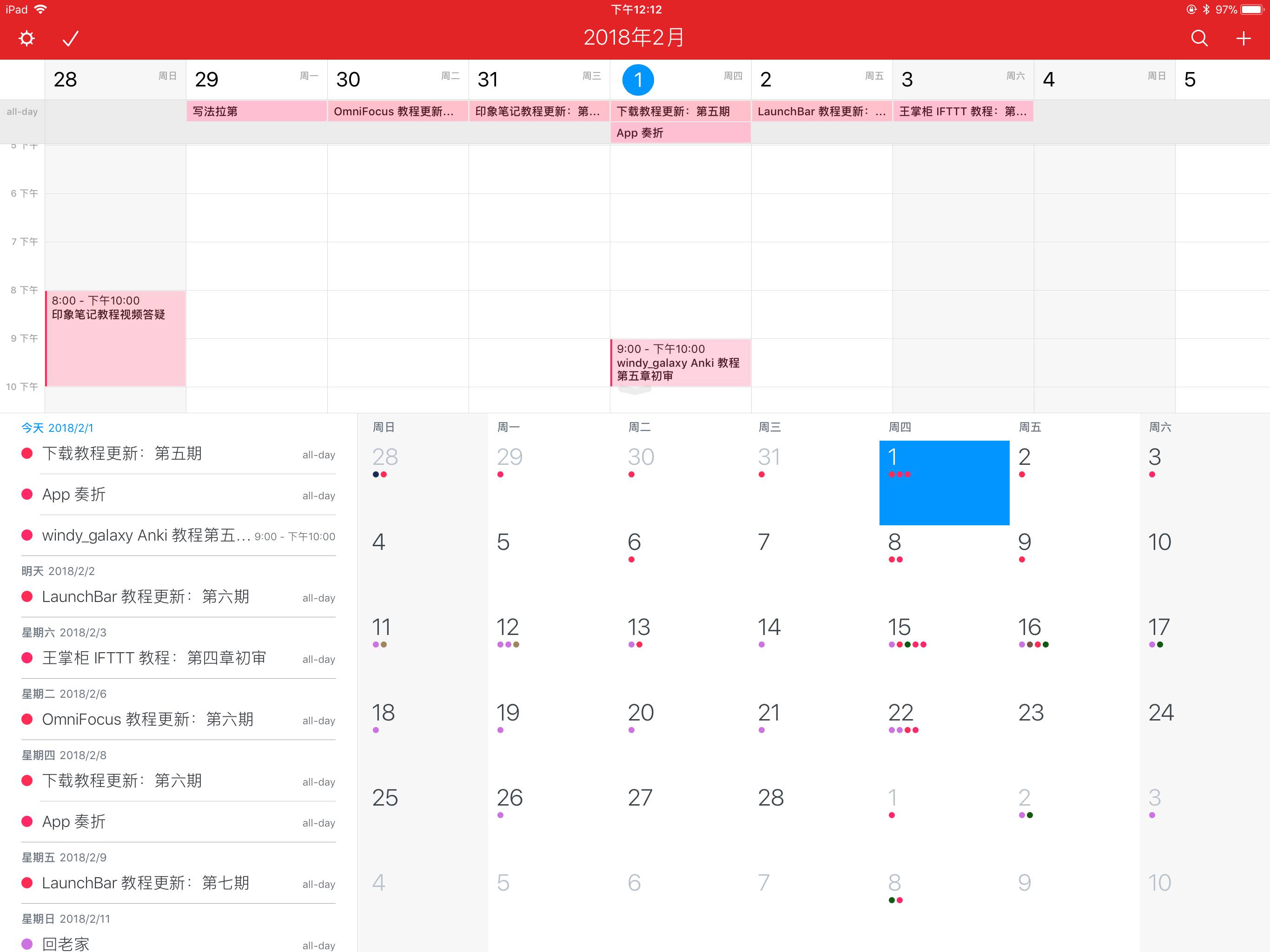 iPad 上的查看:因为设计的空间比较大,所以各个应用在视图上并没有特别重要的区别,所以各位根据喜欢即可,我个人比较偏好 Fantastical 的设计,同时觉得 iPhone 上比较出众的 Timepage 在 iPad 上表现很差;