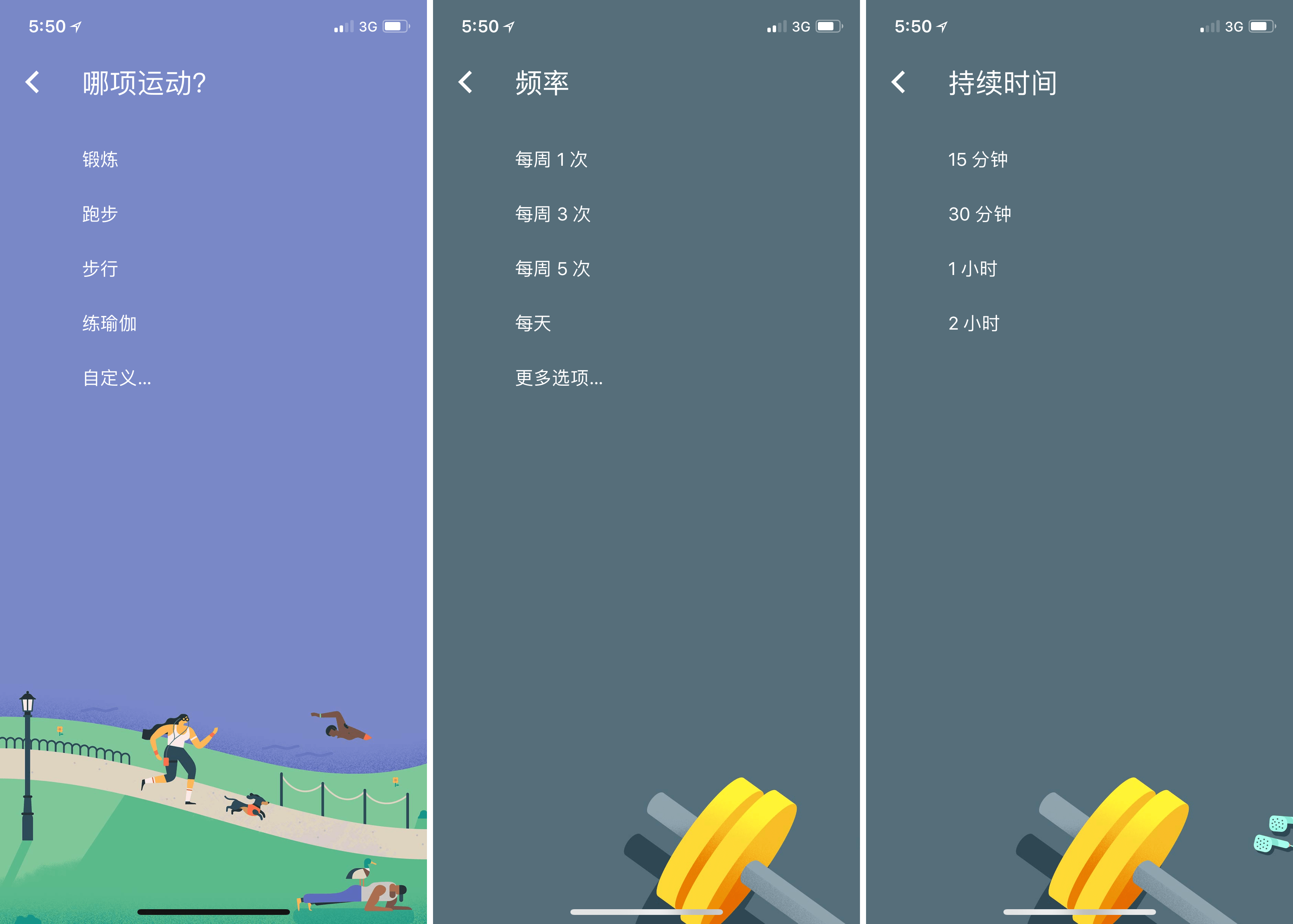 选择「锻炼」后,会让我们继续选择锻炼的项目、一周几次、以及持续时间等:
