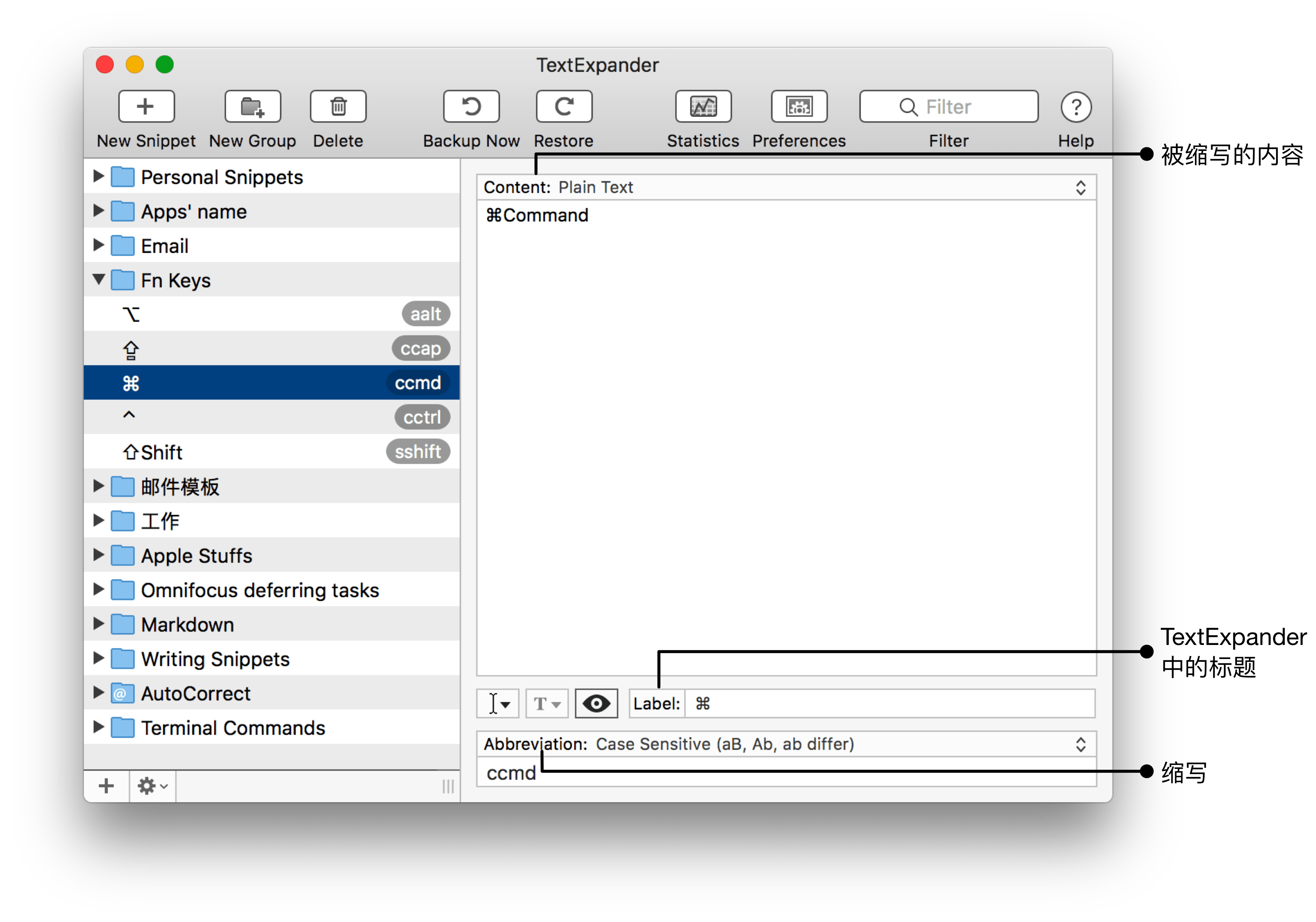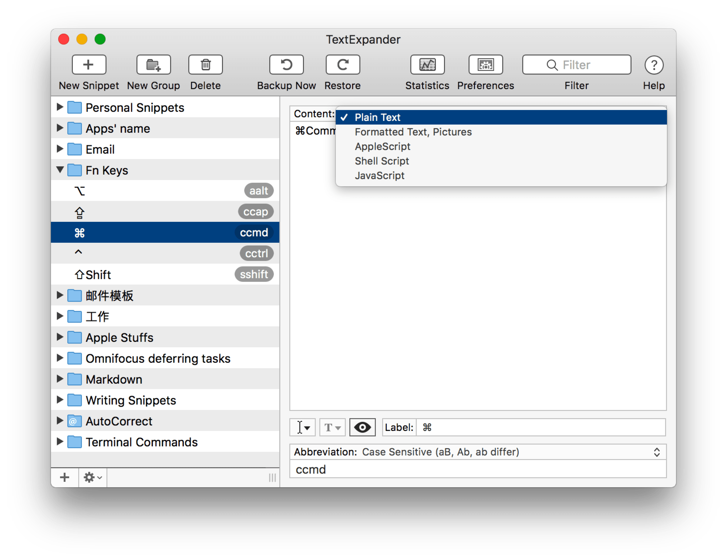 比方说我在写一篇 macOS 的技巧文章,在写到快捷键的部分时,想输入 ⌘Command。这时候,我会遇到两个问题:一是这个 ⌘ 字符很难打,另一个是这个组合此后也会用很多次。这时候,通过 Textpander,进行一番设置之后,只要输入 ccmd ——bang!——就会弹出 ⌘Command 这一组字符。