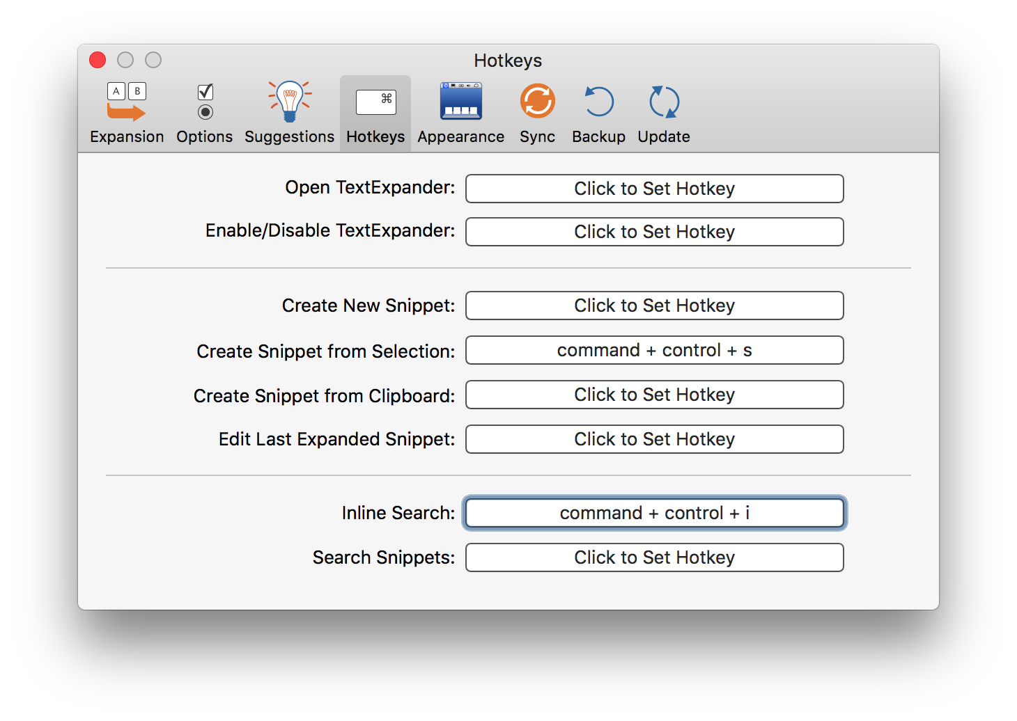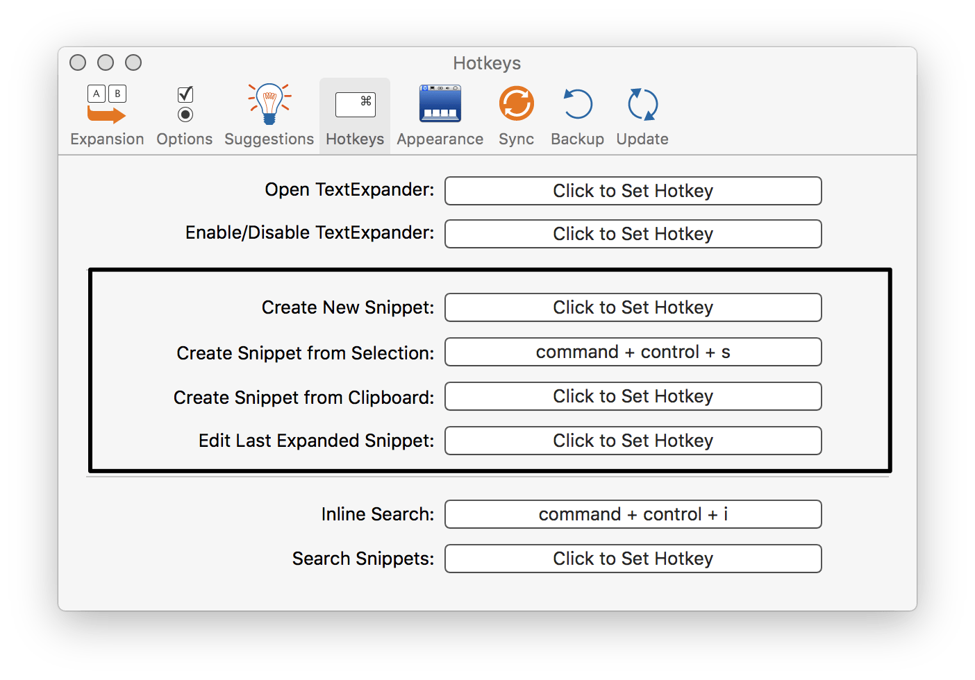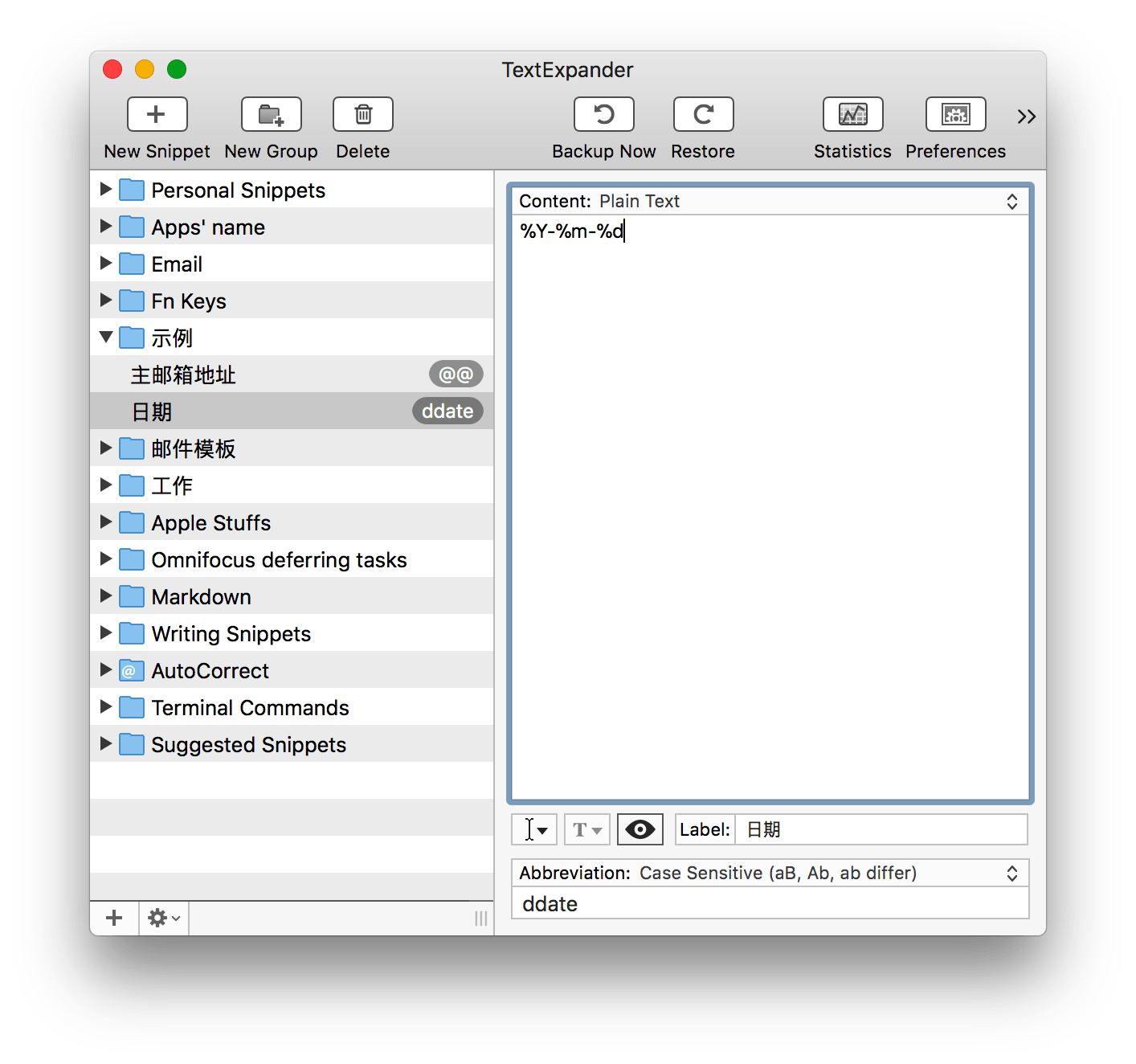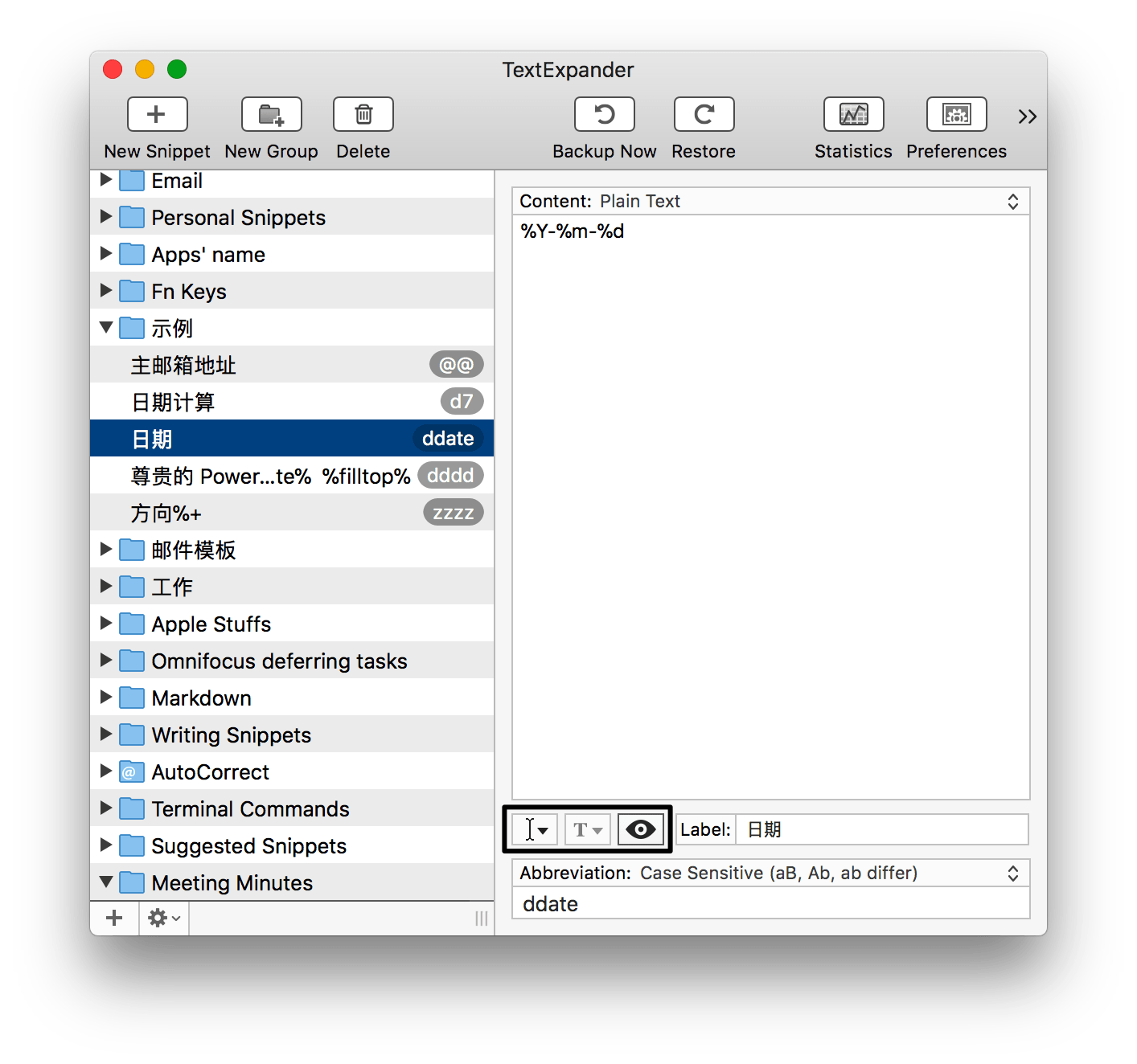 TextExpander 之中,一个文本替换被称为一个 Snippet(片段)。
