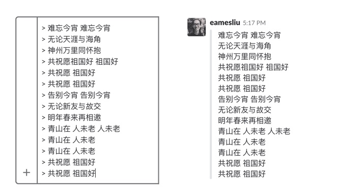 在 Slack 中聊天,经常有需要引用对方多个发言的情况,Slack 是支持 Markdown 的,所以把每一个发言的前面加上一个 > 就可以打出漂亮的引用格式: