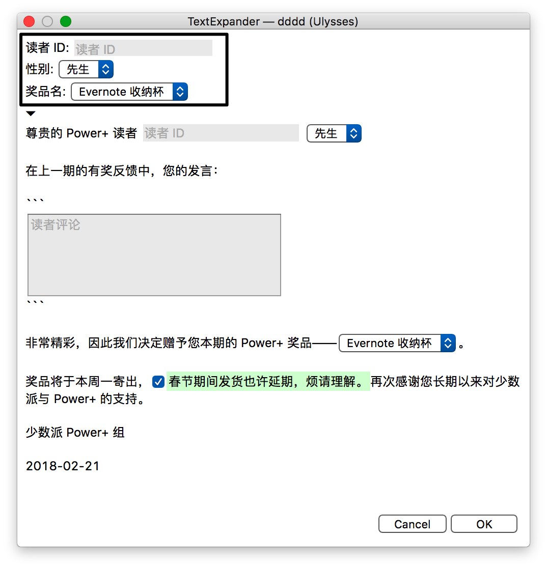 这个功能是 TextExpander 制作模板类内容的杀手锏。它有 4 种填空的模式:
