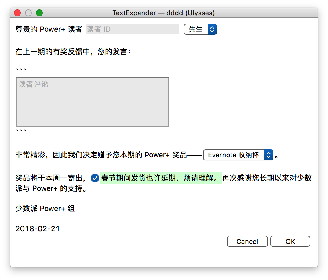 我一个人对 TextExpander 的使用多少是有限制的,欢迎各位 Power User 在评论中分享你们对 TextExpander 的用法,传统的、另辟蹊径的都好,众人拾柴火焰高。