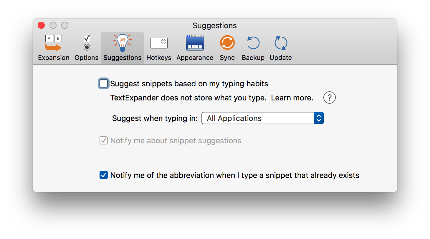 提示缩写这个功能在 TextExpander 的设置选项中的「Suggestions(建议)」分页: