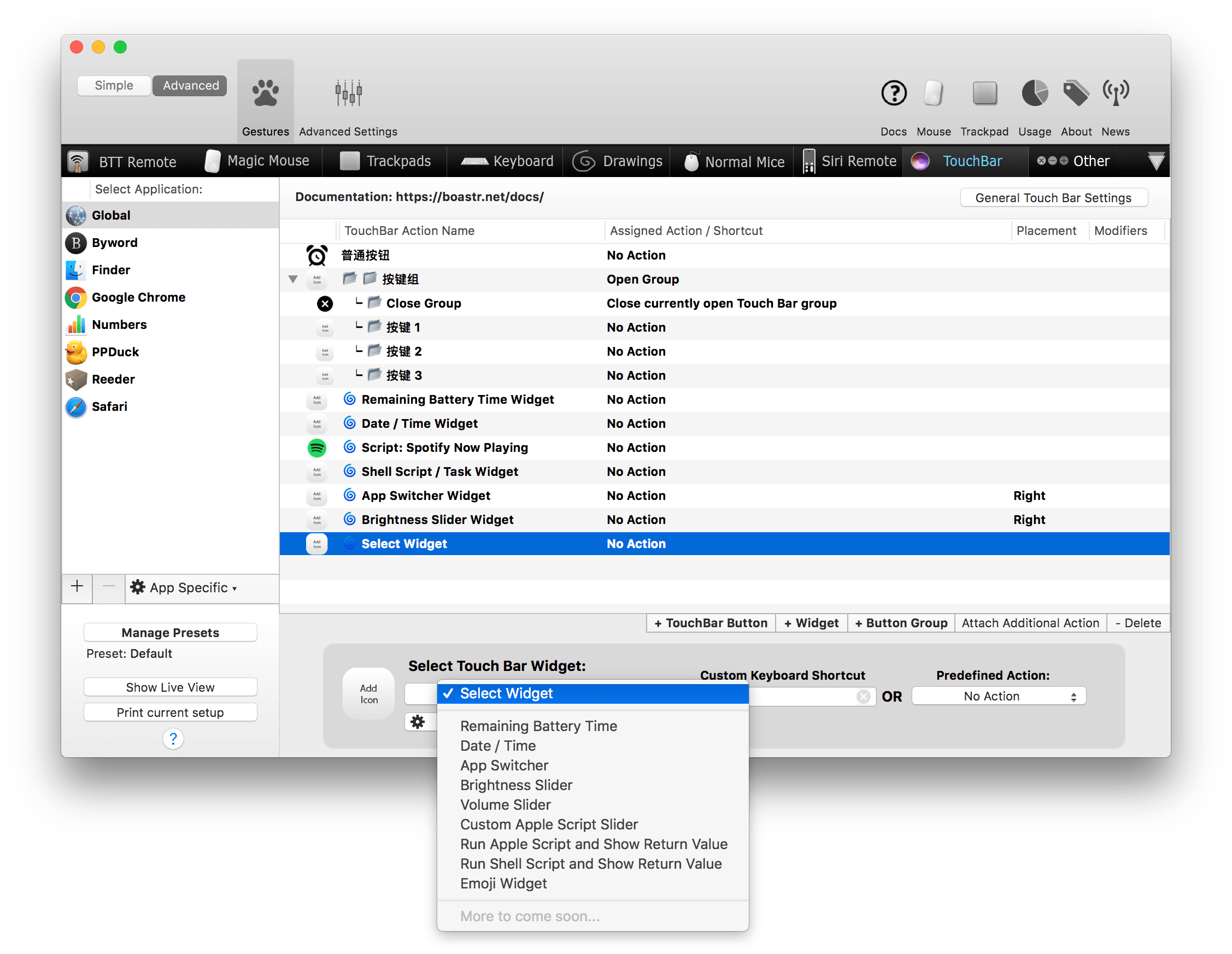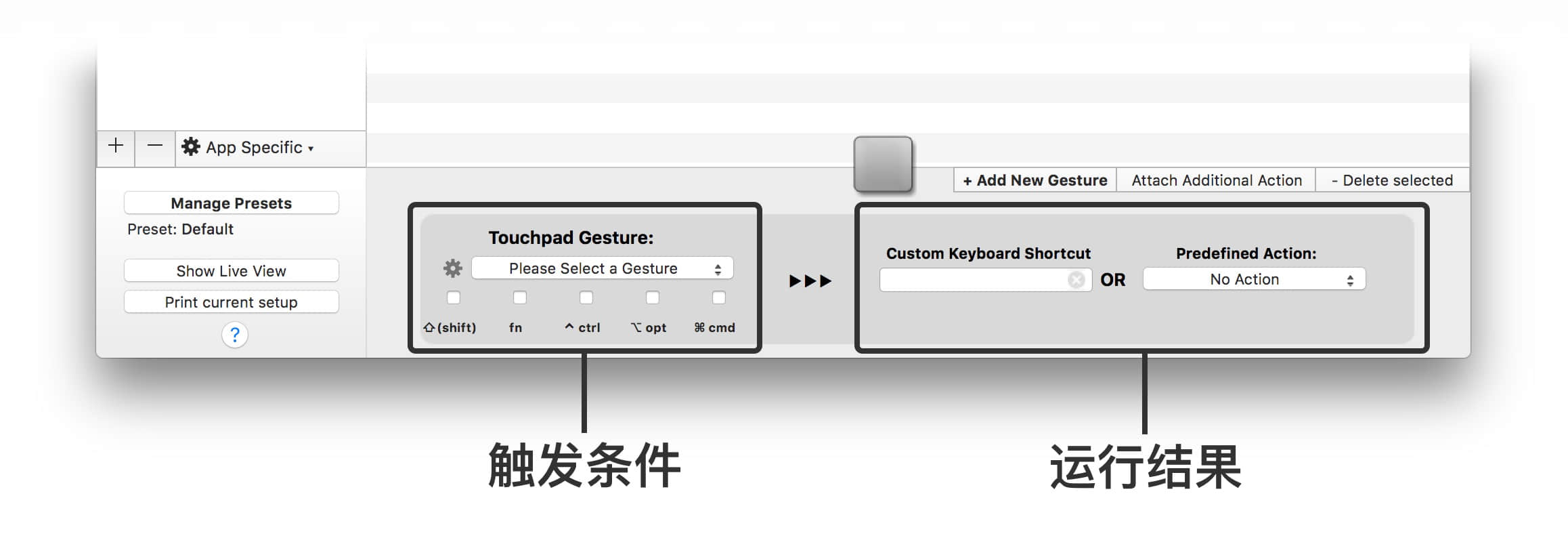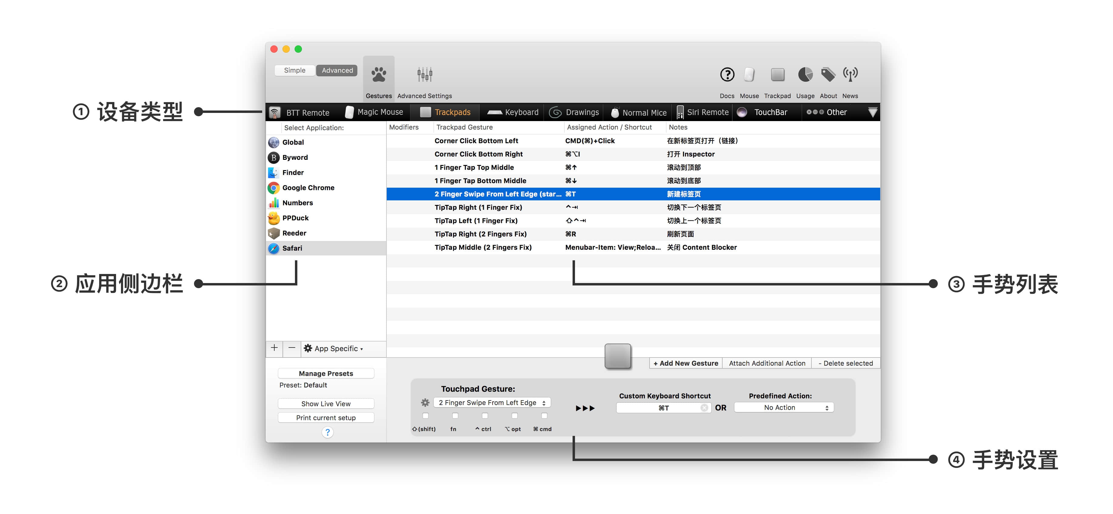 BetterTouchTool 界面主要分为 4 个区域: