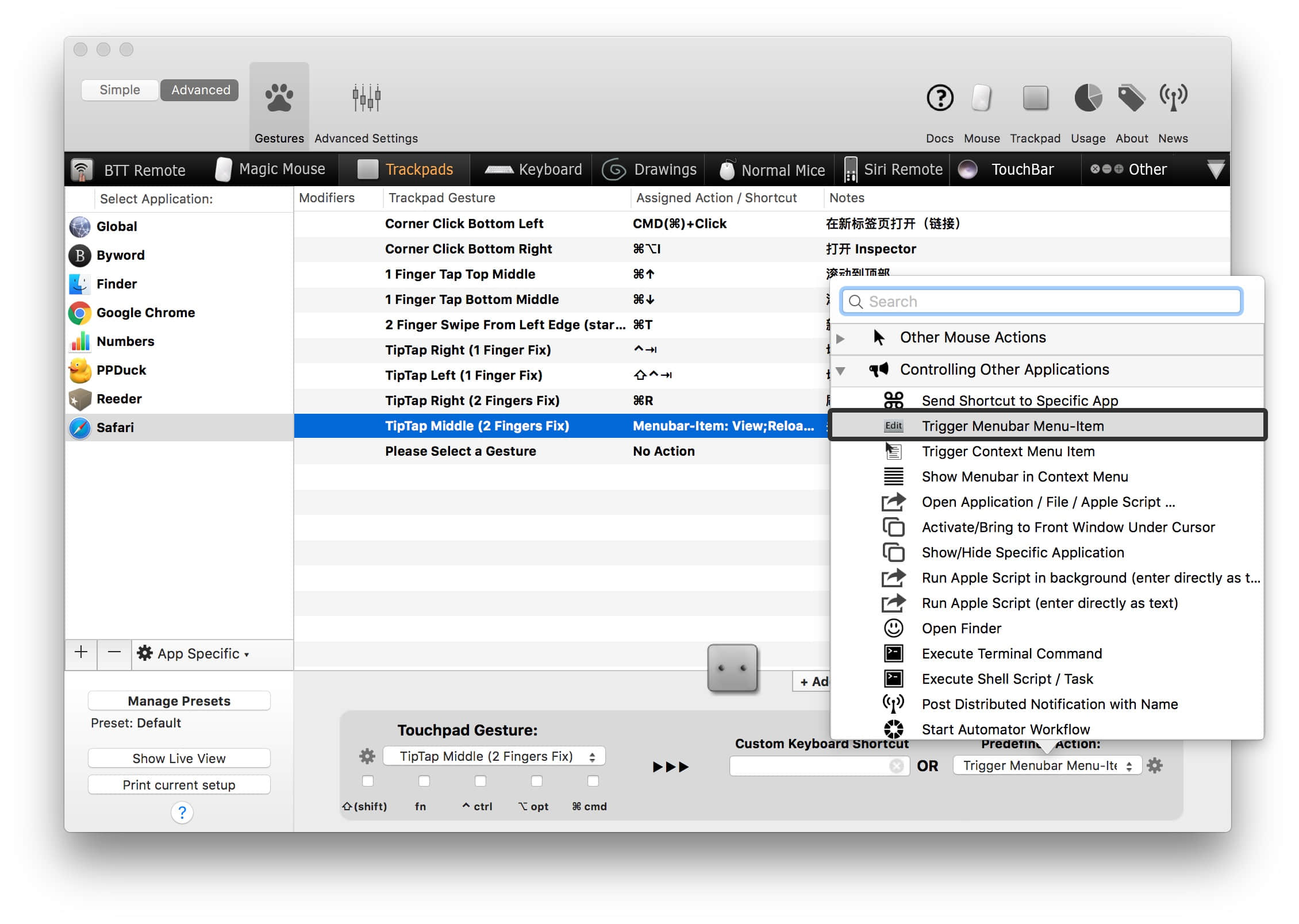 TipTap Middle (2 Fingers Fix) → Menubar-Item: 显示;关闭内容拦截器并重新载入(食指和无名指先放在触控板上,中指轻拍 → 关闭内容拦截器并重新载入):有时候内容拦截器会导致一些页面元素出现问题,用这个手势来临时禁用。需要在「运行结果 - Predefined Action(预设动作)」中选择「Trigger Menubar Menu-item」进行设置,然后填入对应的菜单栏选项名称。