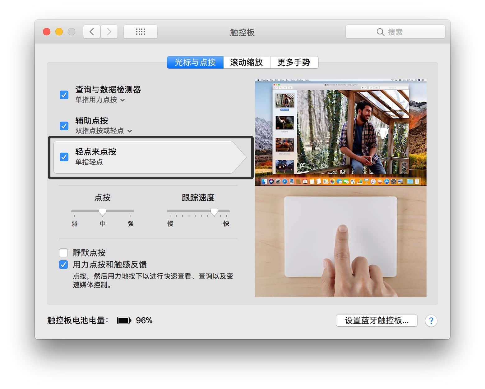 我们先来看触控板的用法,触发条件中可选的有单指、双指、三指、四指等多指手势,还有 Force Touch 手势(新一代触控板专属)。