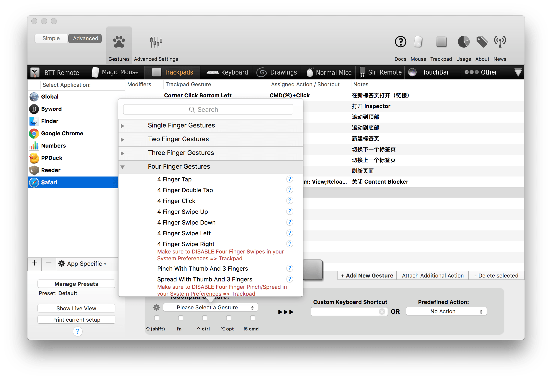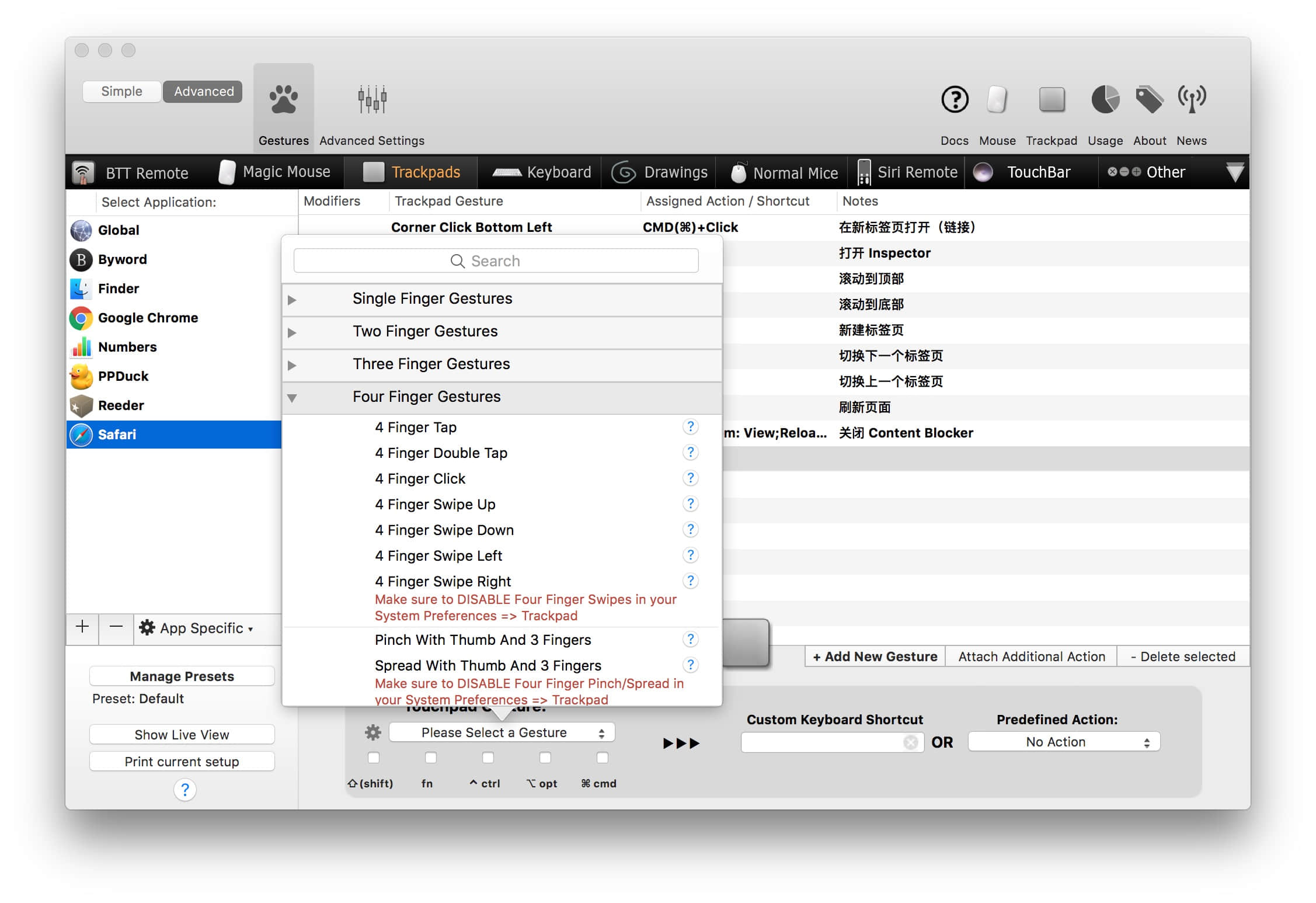 4 Finger Click → ⌘Command-W(四指按下触控板 → 关闭窗口/标签页):使用频率极高的一个手势,不容易发生冲突。