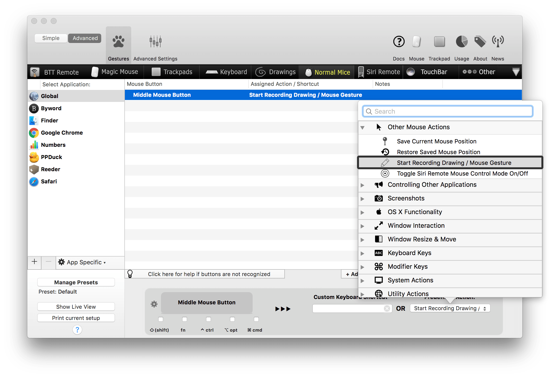 首先你要为 Drawings 设置一个触发手势,我建议可以将 Magic Mouse 设置为「2 Finger Click(双指单击鼠标)」或「Two Finger Touch Top(双指触摸鼠标顶部)」,传统鼠标设置为「Middle Mouse Button(单击鼠标中键)」,然后在 Predefined Action(预设动作)中选择「Start Recording Drawing / Mouse Gesture」。