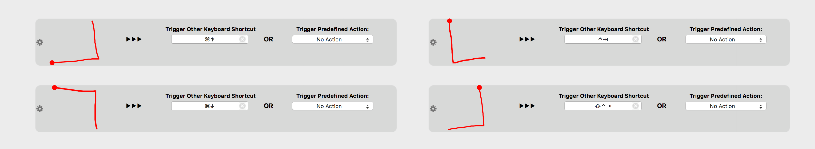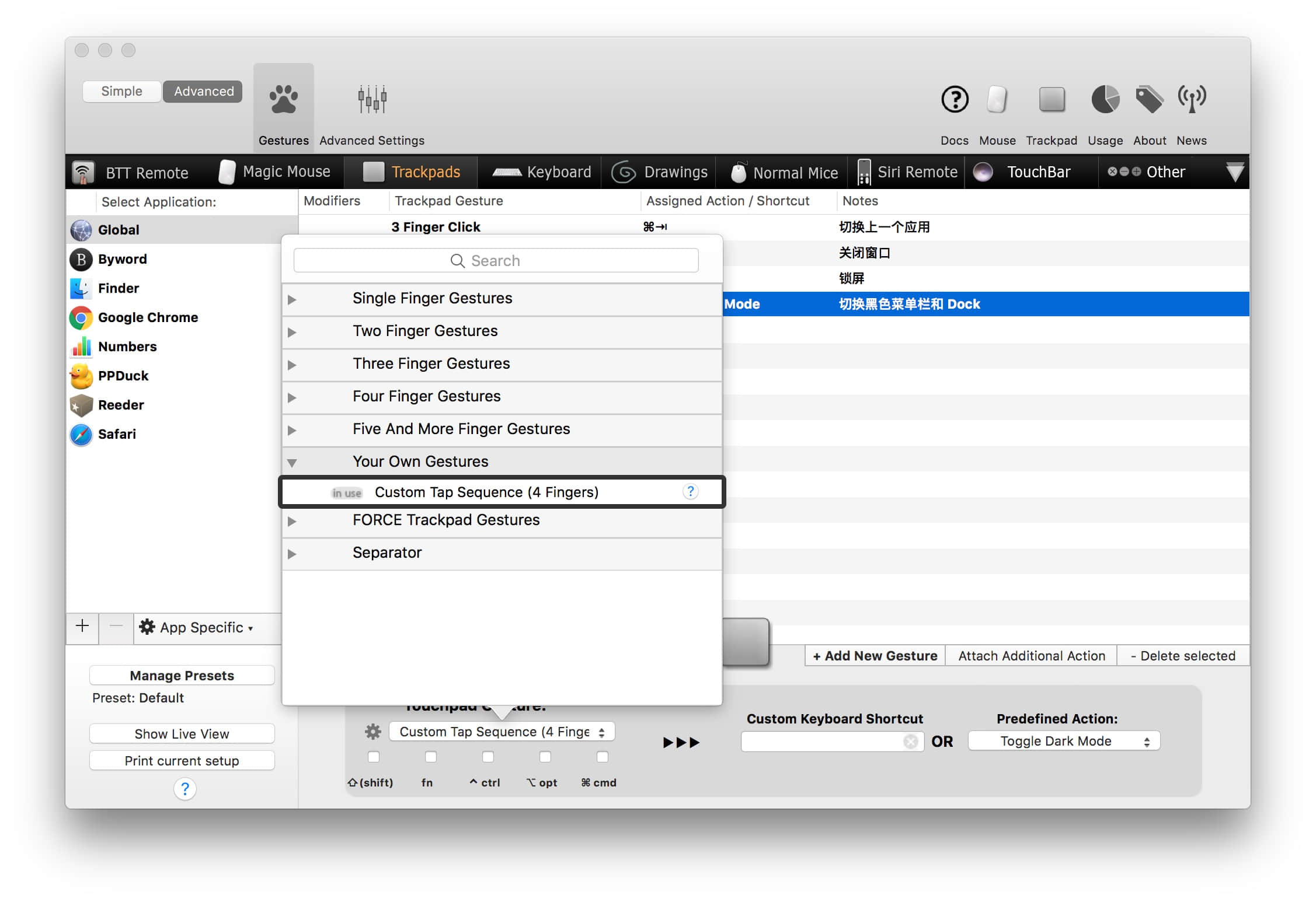 其中 Tap Sequence [4] [3] [2] [1] 这个手势,你可以调整四只手指轻拍的顺序,通过触发条件中的「Your Own Gestures - Custom Tap Sequence (4 Fingers)」进行设置。