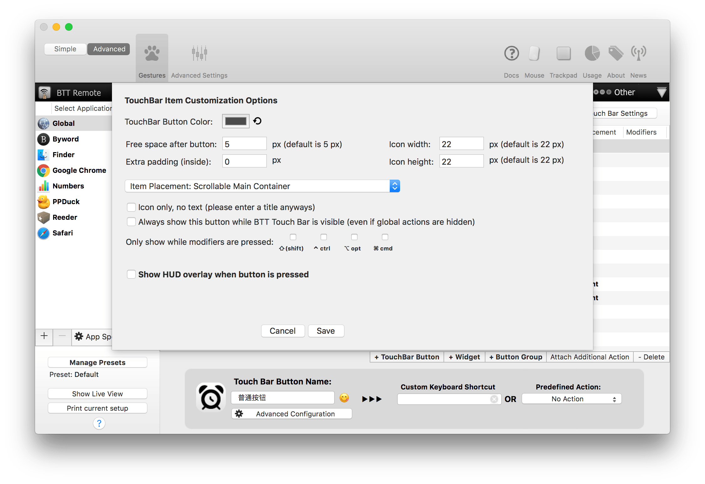 BetterTouchTool 能让你根据自己的需求定制 Touch Bar 按钮,它有 3 种按钮形式: