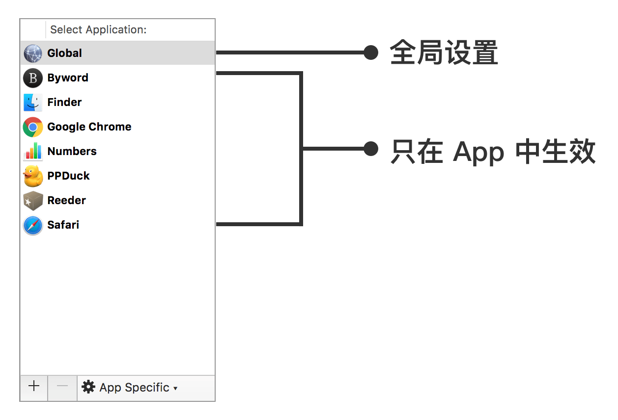 接下来在左边的应用侧边栏中,选择手势在哪些应用里生效,「Global」是全局生效的意思。