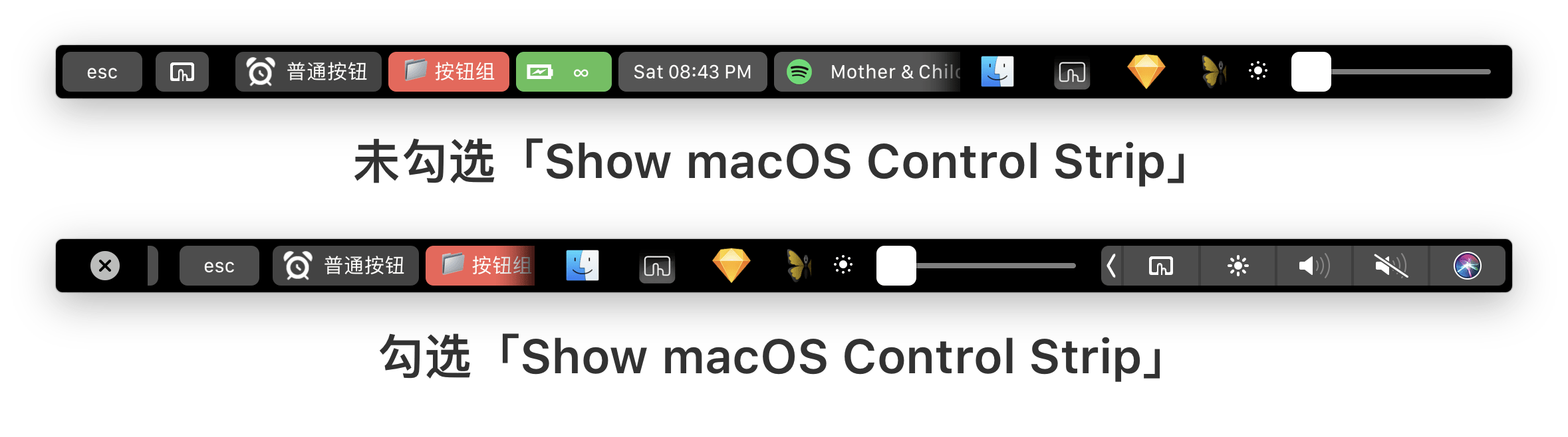 是否勾选「Show macOS Control Strip」的区别