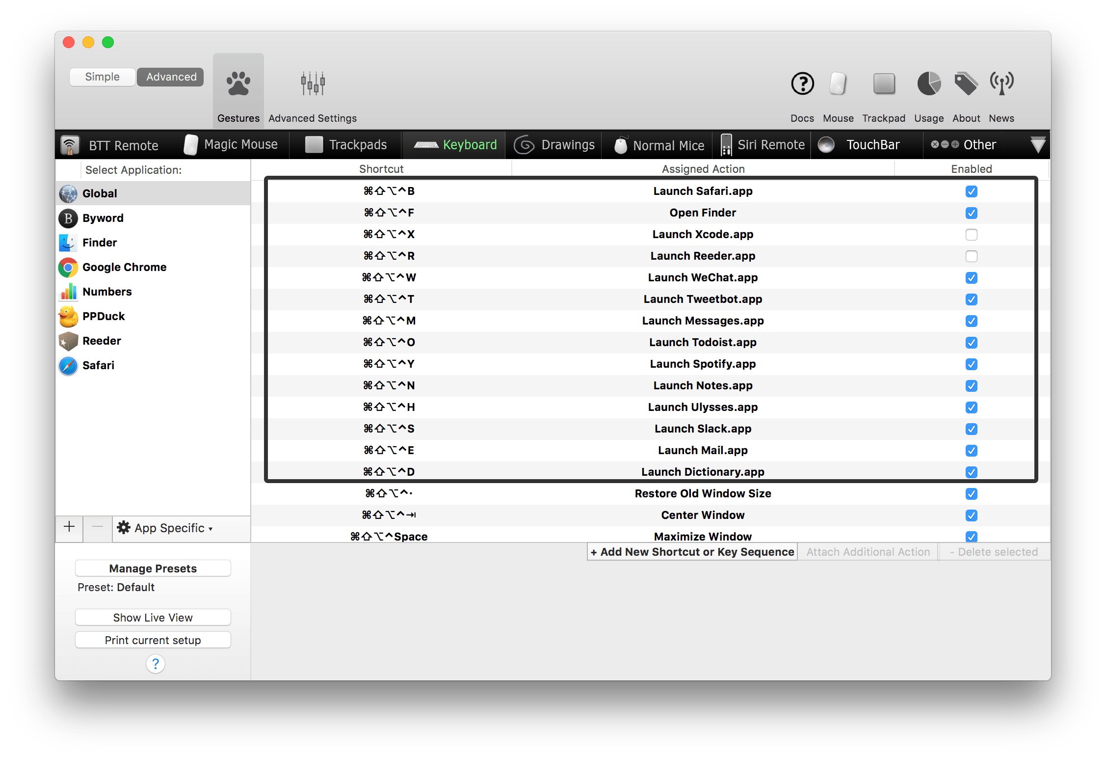 比如我用 BetterTouchTool 统一来管理应用的启动快捷键: