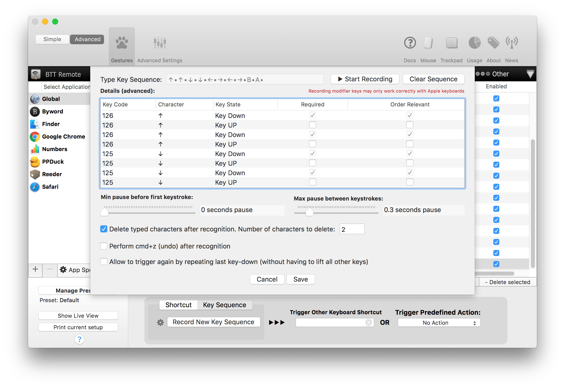但我认为像「上上下下左右左右 BA」这样按下容易出现误操作,后者,则完全无法跟 TextExpander 等专业工具相比,比如无法移动光标,无法调整格式。此外,BetterTouchTool 的连续快捷键设定也比较繁琐,有需求的朋友建议还是选择 TextExpander 等专业工具。