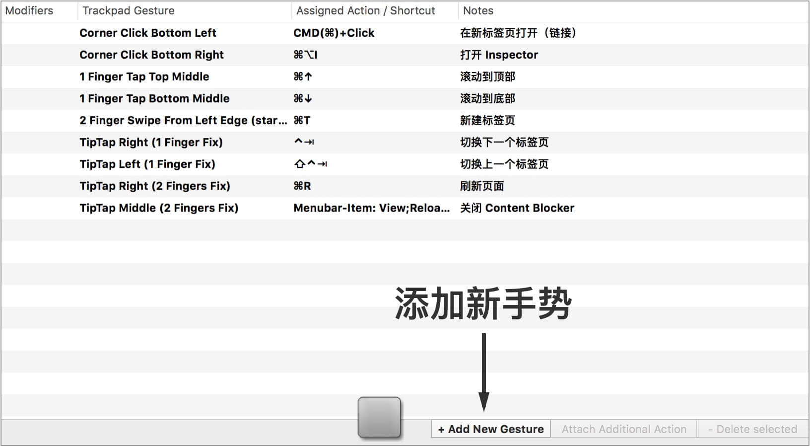 然后点击中间手势列表的「+ Add New Gesture」添加新手势。