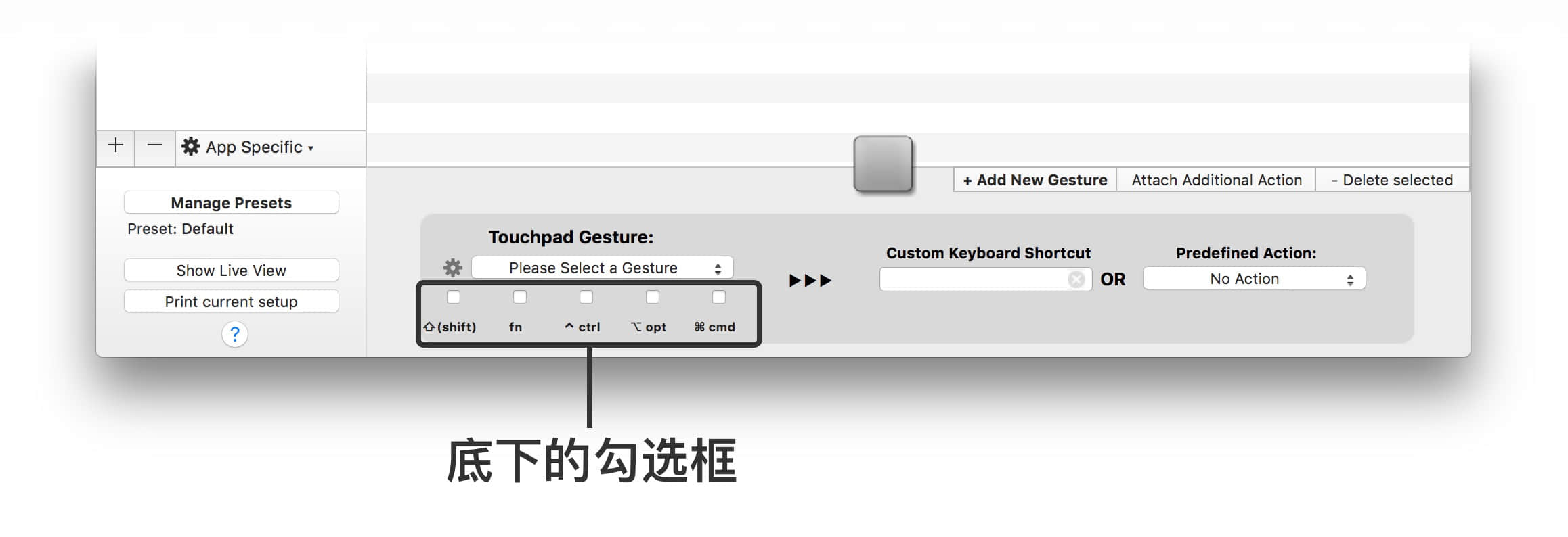 底下勾选框的意思是:你需要同时按住这些按键,再作出触控板手势,才会生效,目的是为了防止手势冲突。但我个人觉得比较累赘,而且我在设置手势时会尽量避免冲突,因此一般都不使用这个功能。