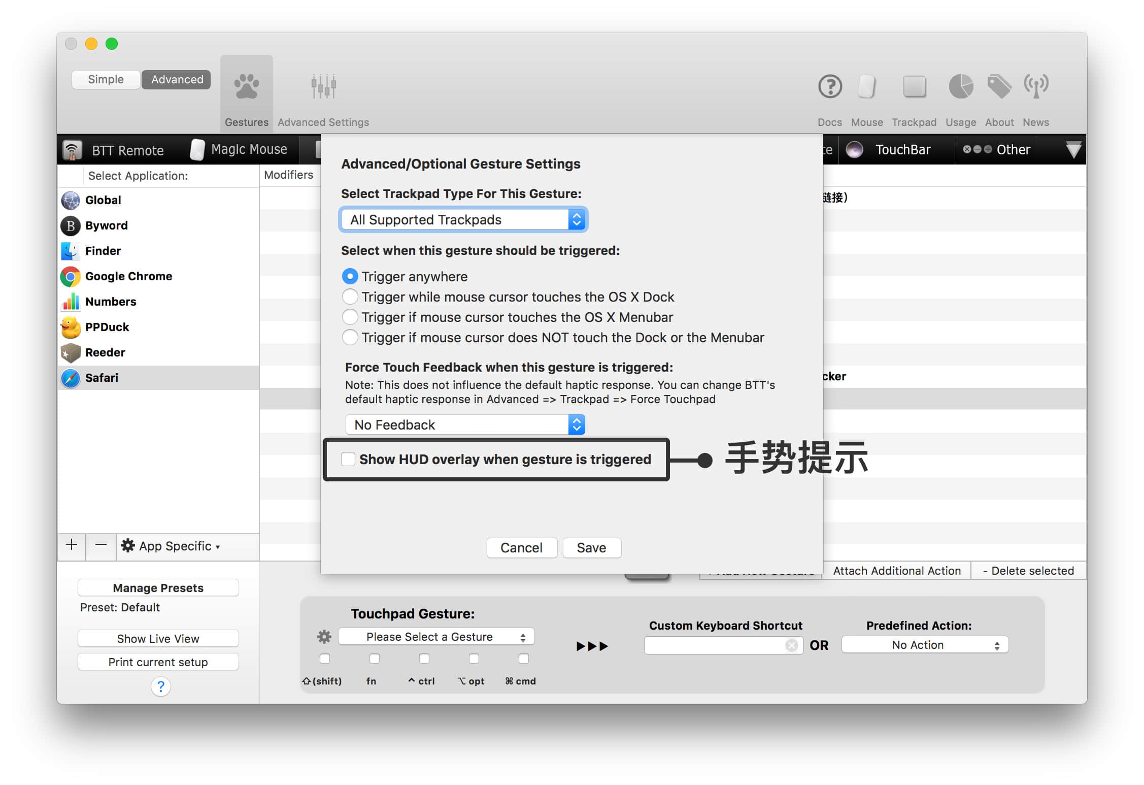 左边的「小齿轮」可以进一步调试适用范围,其中值得一提的是最后一项「Show HUD」功能,它能让你在屏幕中央显示提示,类似系统自带的亮度调节和音量调节提示,让你知道手势触发成功了。