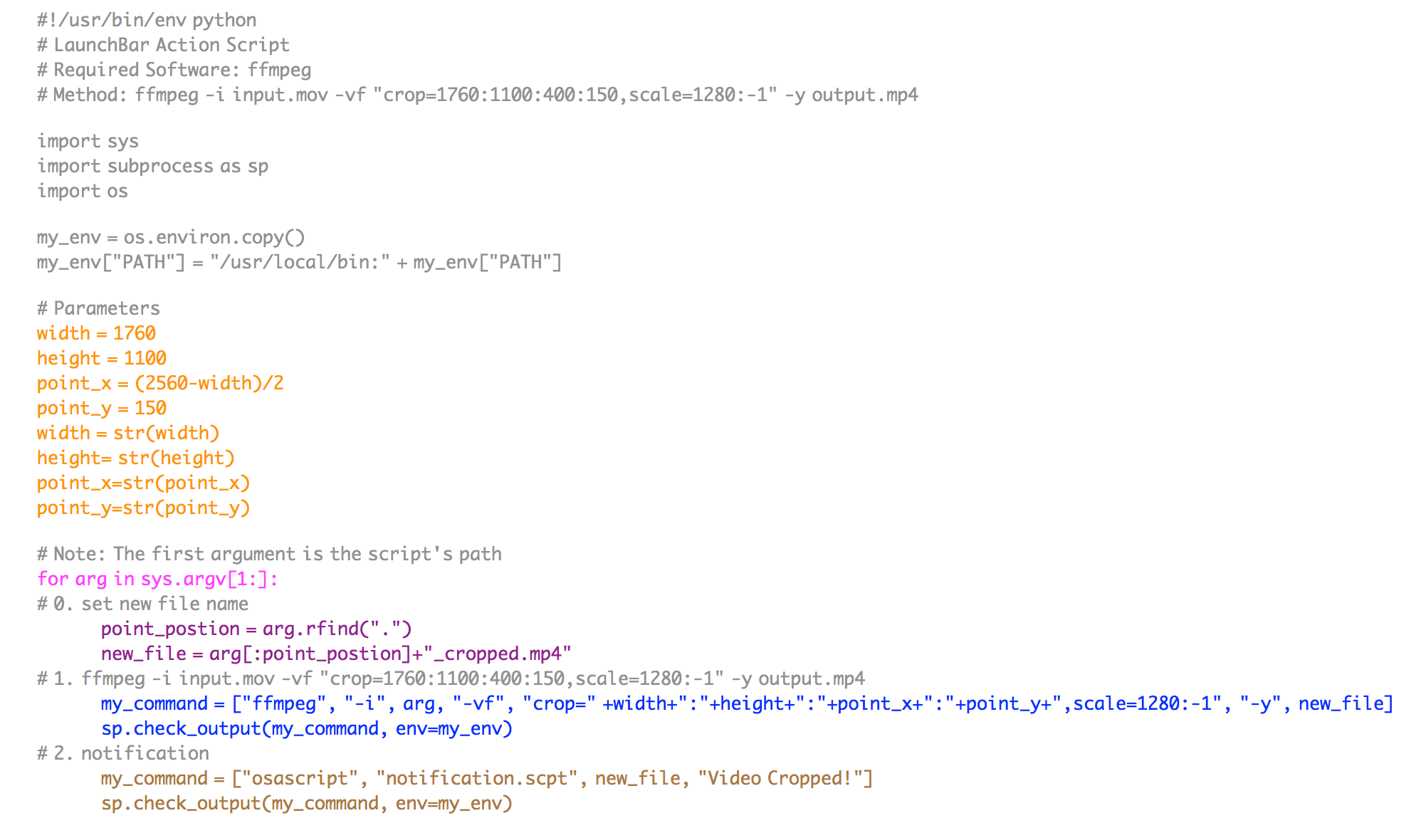 于是我用它制作了一个 LaunchBar 动作,用于对视频进行统一的批量裁剪。运行效果如下: