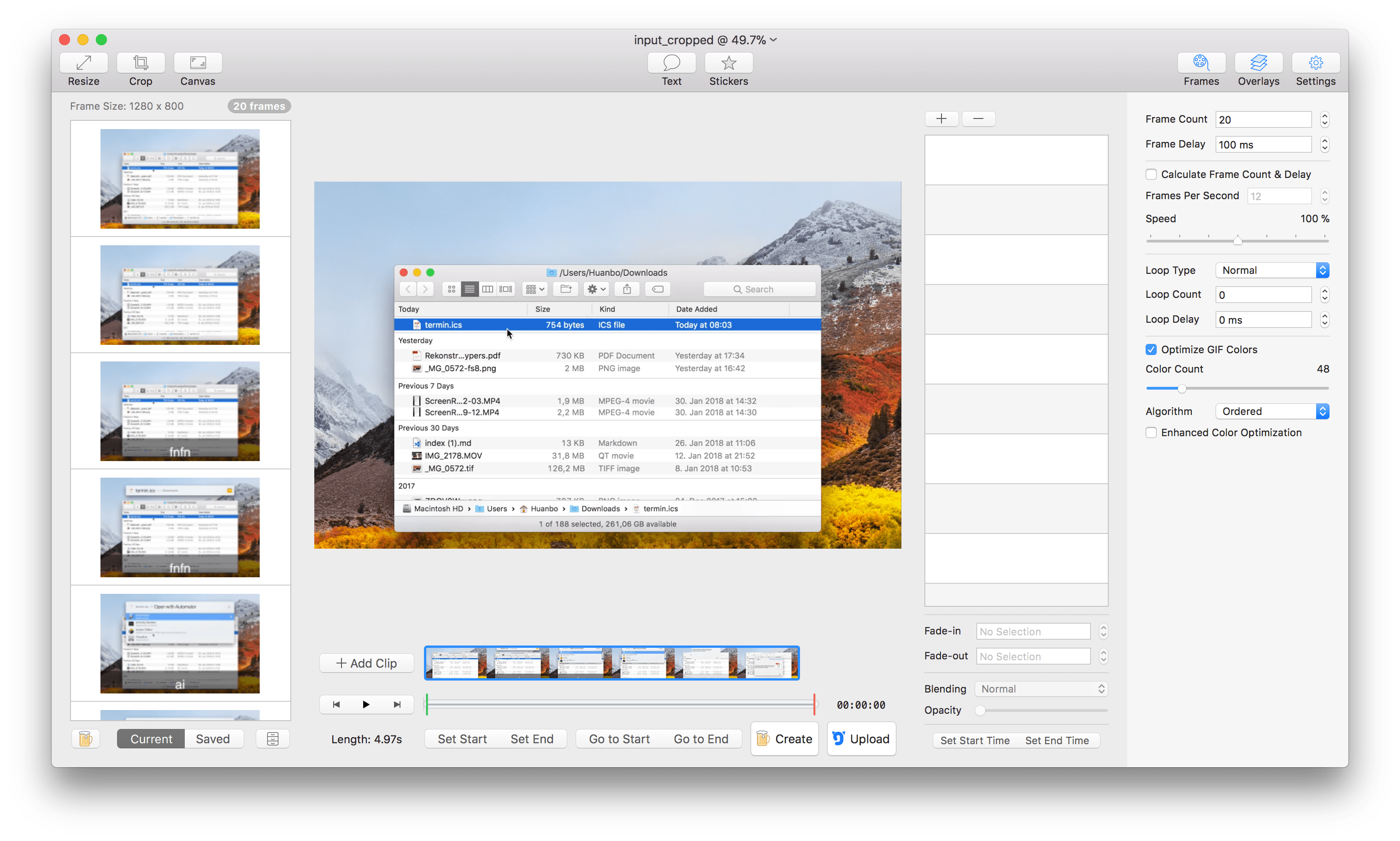 在这个动作的脚本中我还在这两行命令之后添加了一行命令,用以借助 gifsicle 对生成的 GIF 文件进行可以接受范围内的进一步压缩: