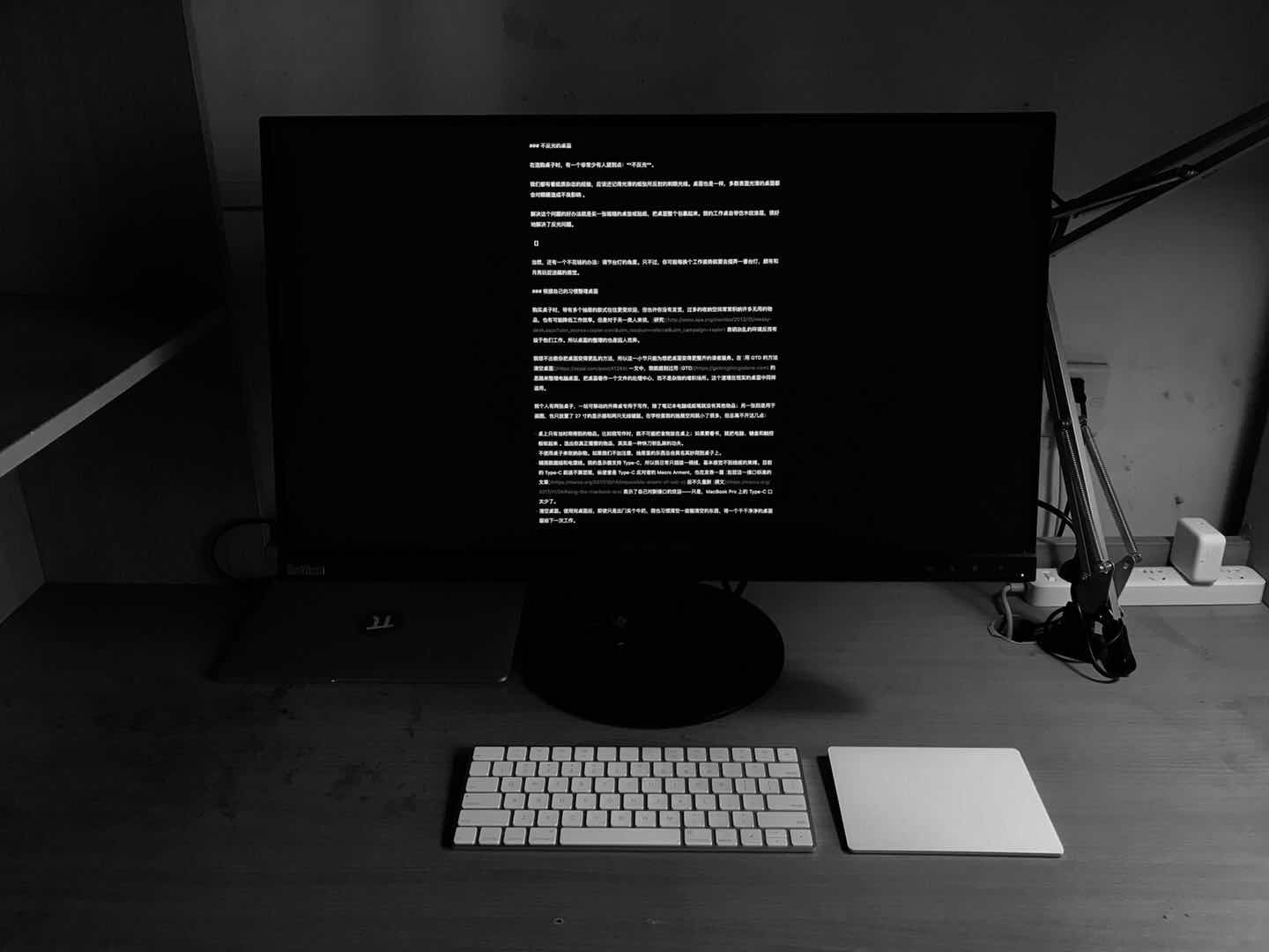精简数据线和电源线。我的显示器支持 Type-C,所以我日常只插拔一根线,基本感觉不到线缆的束缚。目前的 Type-C 前途不算悲观,纵使曾是 Type-C 反对者的 Macro Arment,也在发表一篇 批驳这一接口标准的文章 后不久重新 撰文 表示了自己对新接口的欢迎——只是,MacBook Pro 上的 Type-C 口太少了。 清空桌面。使用完桌面后,即使只是出门买个牛奶,我也习惯清空一些能清空的东西,将一个干干净净的桌面留给下一次工作。