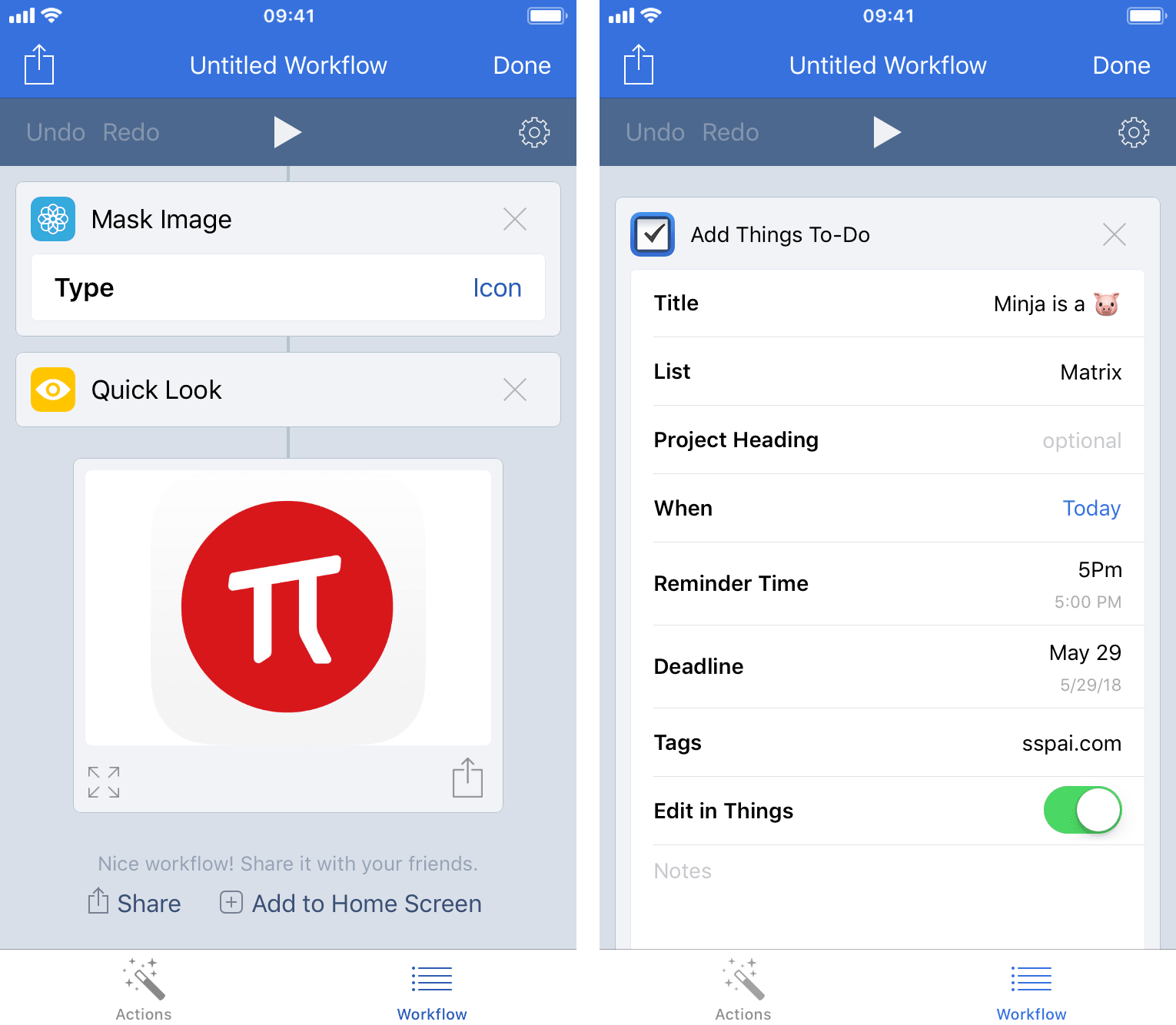 另一个比较吸引人的功能就是对 Things 的支持。其实这也是跟上了 Things 新推出的 URL Scheme,把相对复杂的 URL Scheme 做成了简单的图形界面,让用户更容易制作自动化动作。
