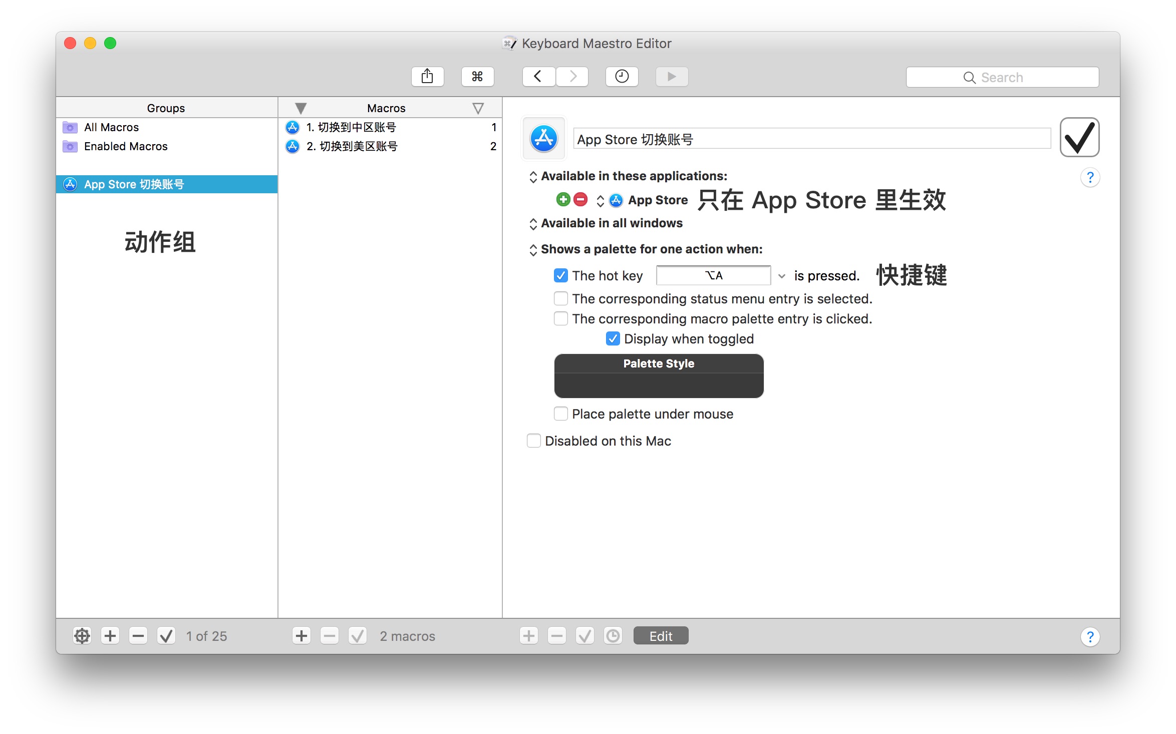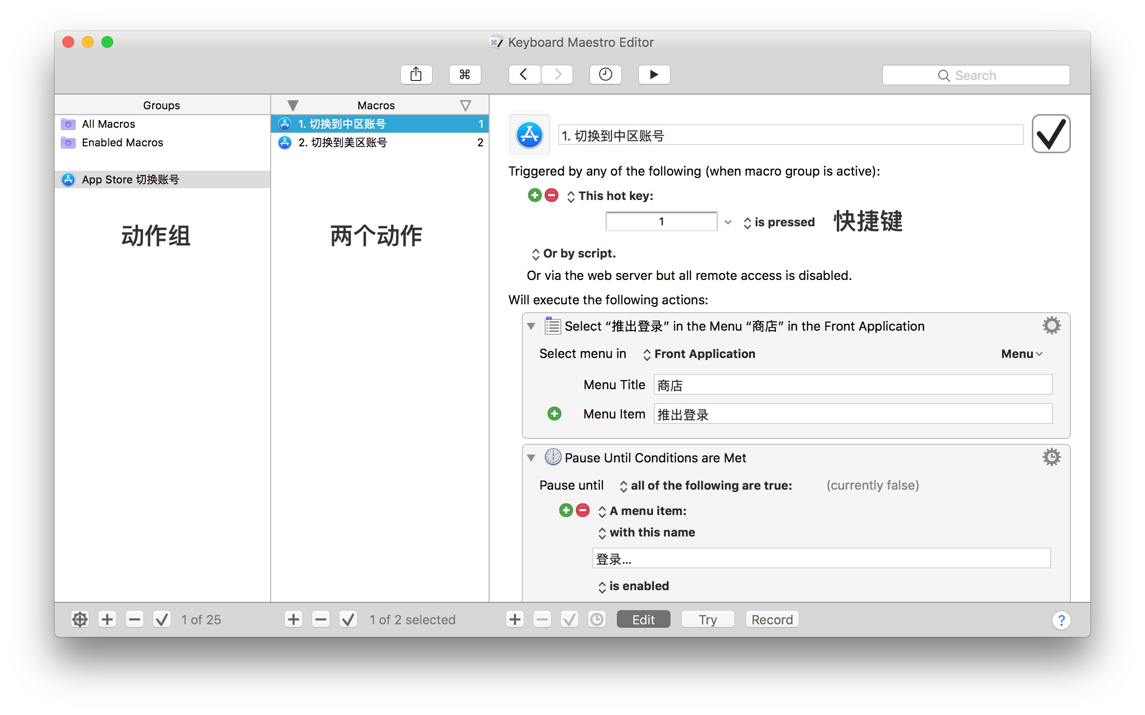 在动作组中创建两个动作(Keyboard Maestro 中叫做 Marcos),一个是切换到中区账号,另一个是切换到美区账号,并设置触发方式为 Hot Key Trigger,设置为1 和 2。