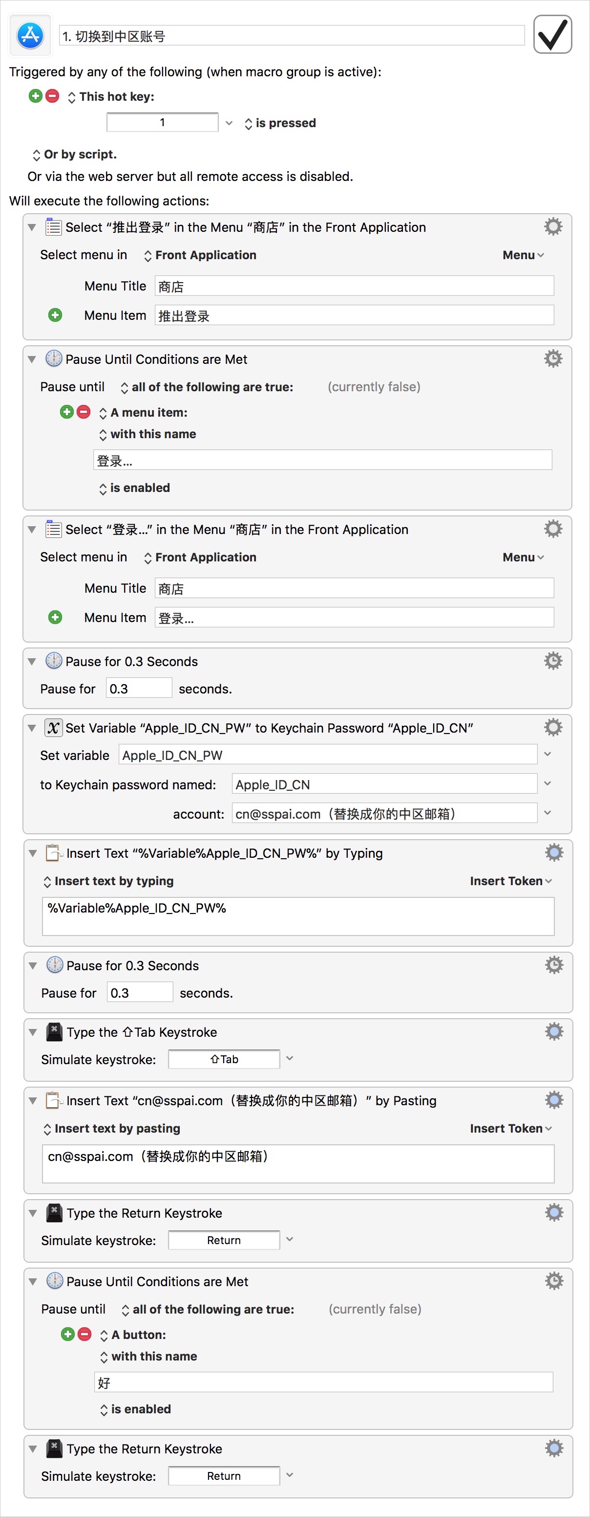 在 Mac 上,roamlog 曾写过一篇教程,使用 Keyboard Maestro 来进行一键切换,将中间繁琐的注销登录等重复操作交给机器,能节省掉我们大量的时间。但随着 macOS 系统的升级,一些菜单栏选项的名称和操作顺序都发生了变化,因此这个 Keyboard Maestro 也需要进行一些修订。 Mac App Store 和 iTunes Store 切换账号的动作稍有不同,你可以先下载我做好的 Keyboard Maestro 动作,再接着看后面的动作讲解: