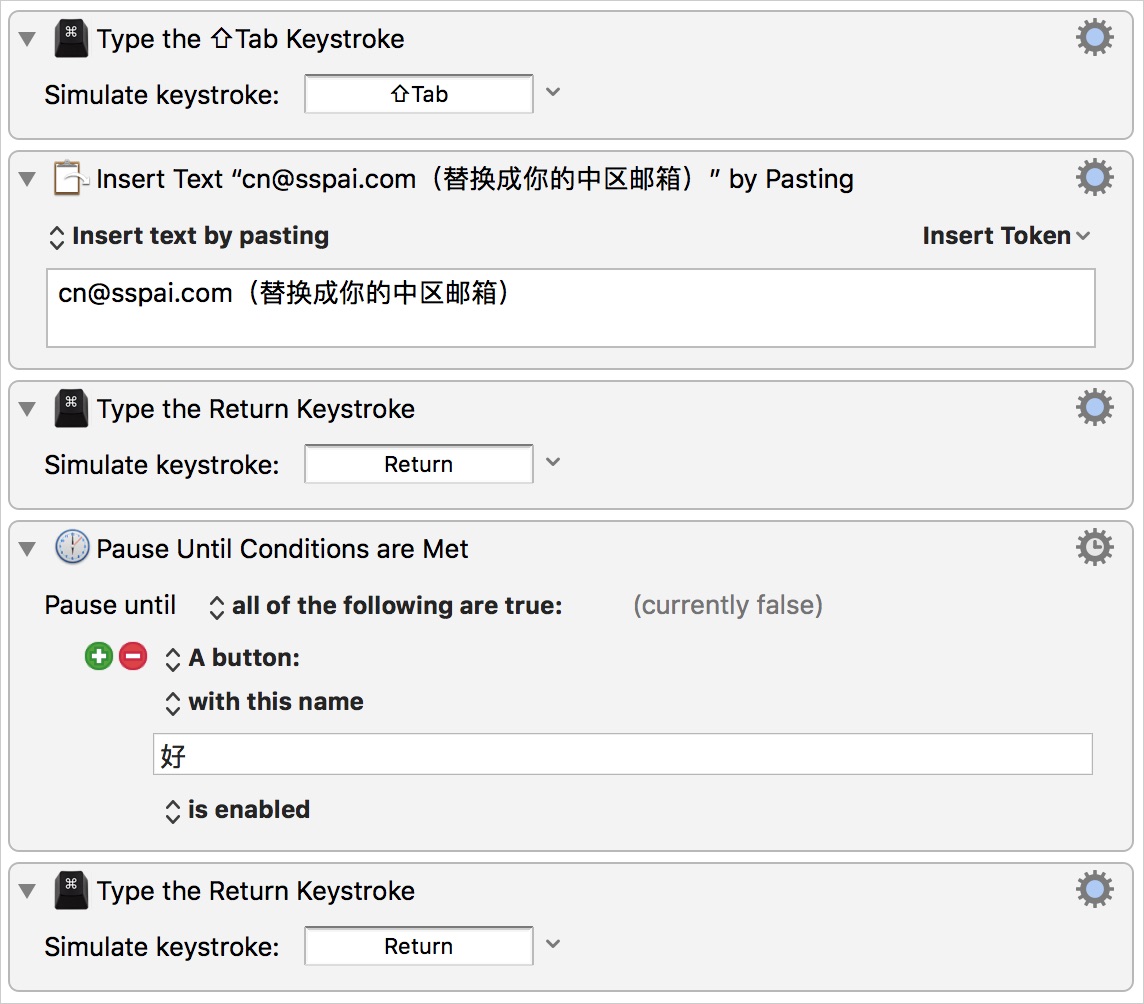 后面这部分很好理解,由于登录 App Store 时是先填密码再填邮箱,所以需要按下 ⇧Shift-Tab 来聚焦到邮箱。最后一步则是等待「好」按钮出现并自动按下。
