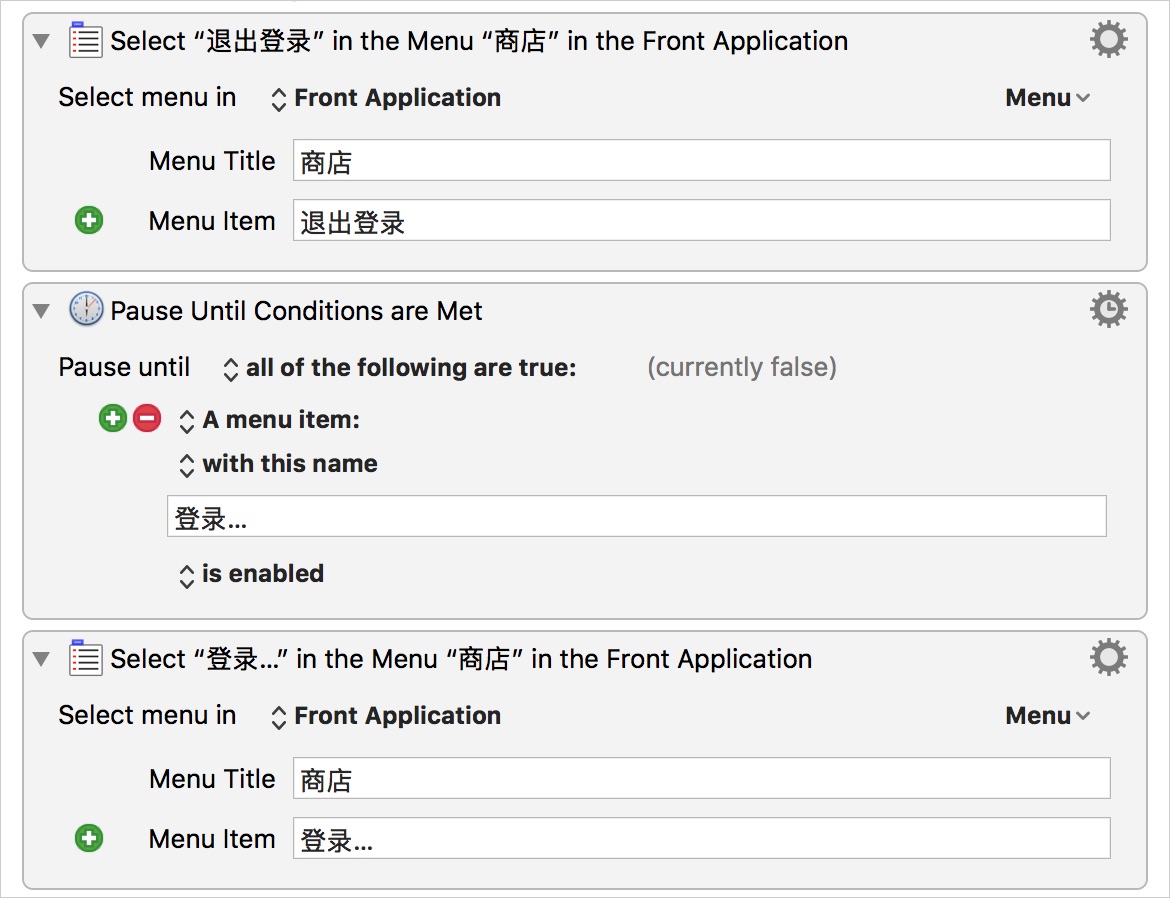 此外,iTunes 的菜单名称也和 App Store 有一些区别,比如「商店 → 帐户」和「退出登录 → 退出登录…」,前面下载两个动作里,我已经为你提前修改好了,你只需要将里面的邮箱修改成自己的 Apple ID 就行。