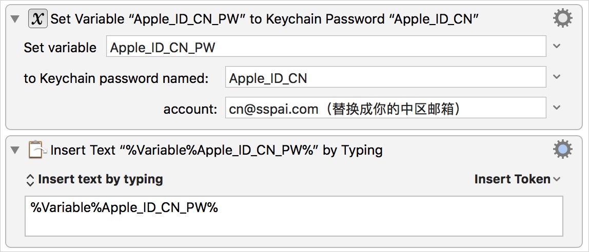 下一步则是用到了 Keyboard Maestro 的变量(Variable)功能,如果一个变量的名称以「Password、PW」开头或结尾,那么它们的内容将不会被储存在 Keyboard Maestro 中,而是直接访问 iCloud 钥匙串里的数据,并使用 Insert Text 粘贴进 App Store 中,避免应用和剪贴板知道你的密码,保护我们的隐私。