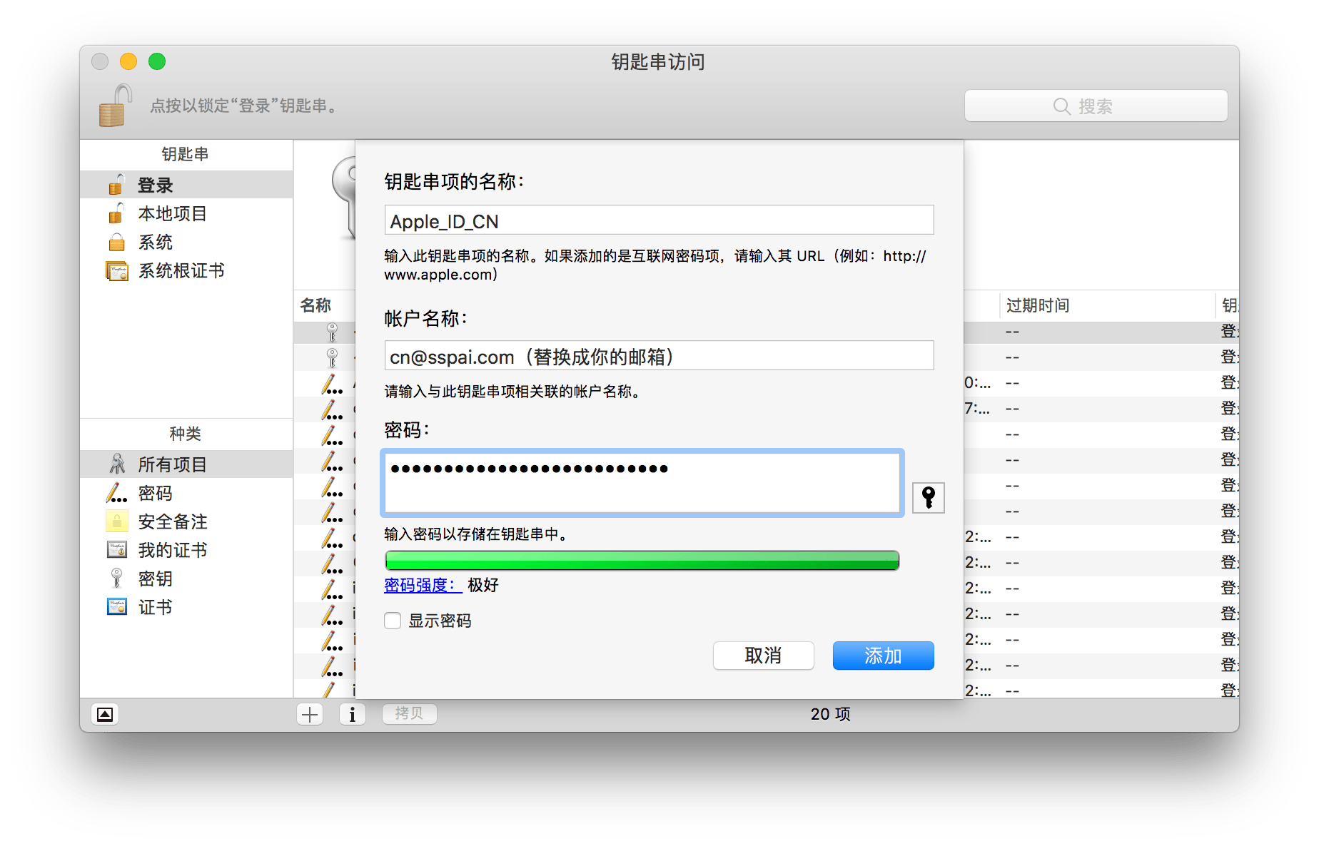 我们需要到钥匙串访问 App 中,创建一个名为「Apple_ID_CN」的密码。用户名称和密码则对应你的 Apple ID。
