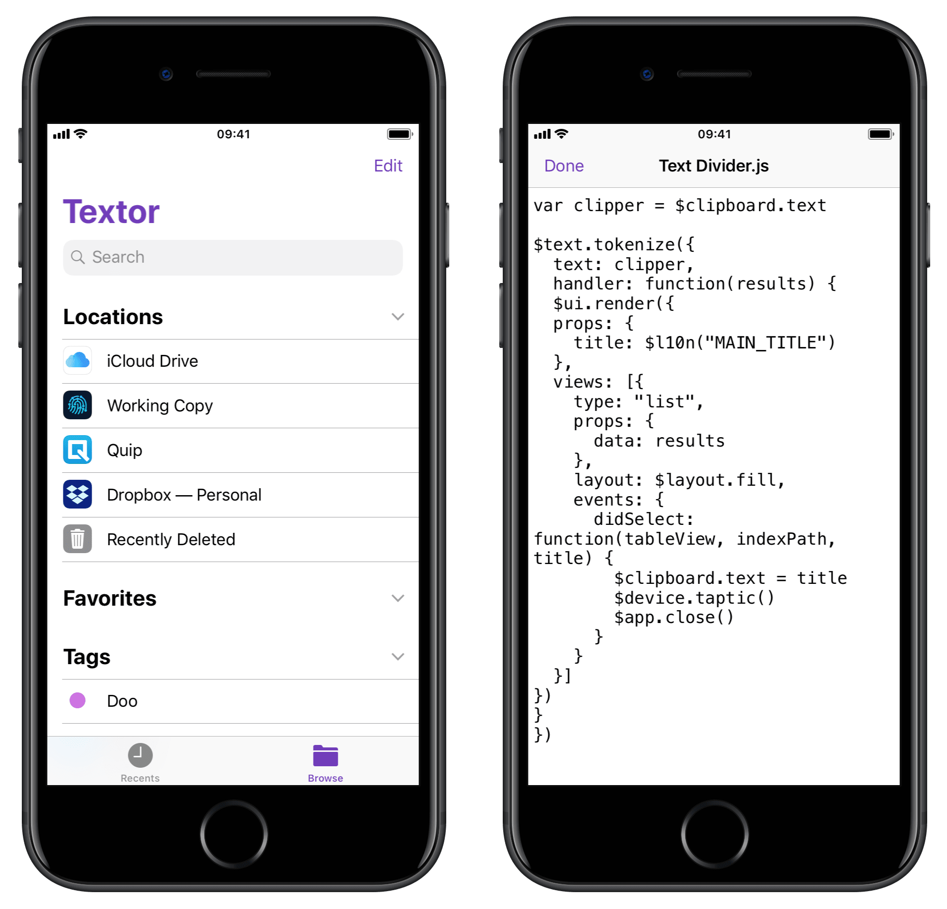 总的来说,Textor 没有什么惊人的功能,但是填上了 iOS 上的一个功能缺口,我们可以在此基础上继续拓展自己的工作流。我就通过 Textor 来编辑 .js 脚本文件,然后复制到 Drafts 里;另外,我还把许多 Power+ 文章中提到的脚本文件存在 Working Copy(一个 GitHub 客户端)中,有了 Textor 之后我就能随时做一些小修改,不用总是回复读者「等我回去开电脑改」了。