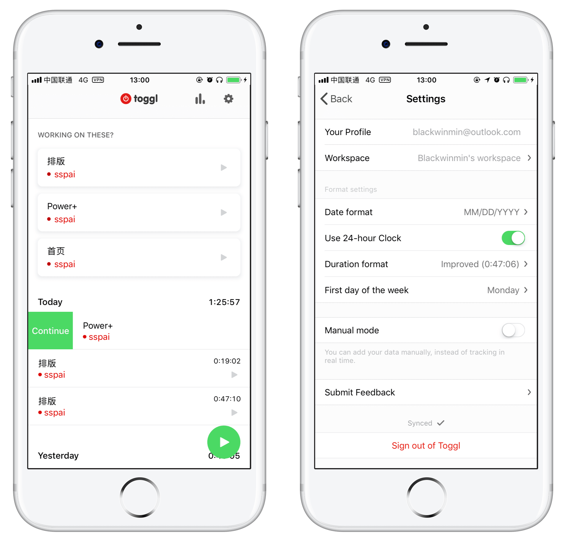 此外,Toggl 也提供了更加丰富的记录格式,可以对每周开始日、日期格式等进行自定义,如果你需要把记录数据导出成表格以进行进一步统计、分析,这些个性化的设置就能派上用场。