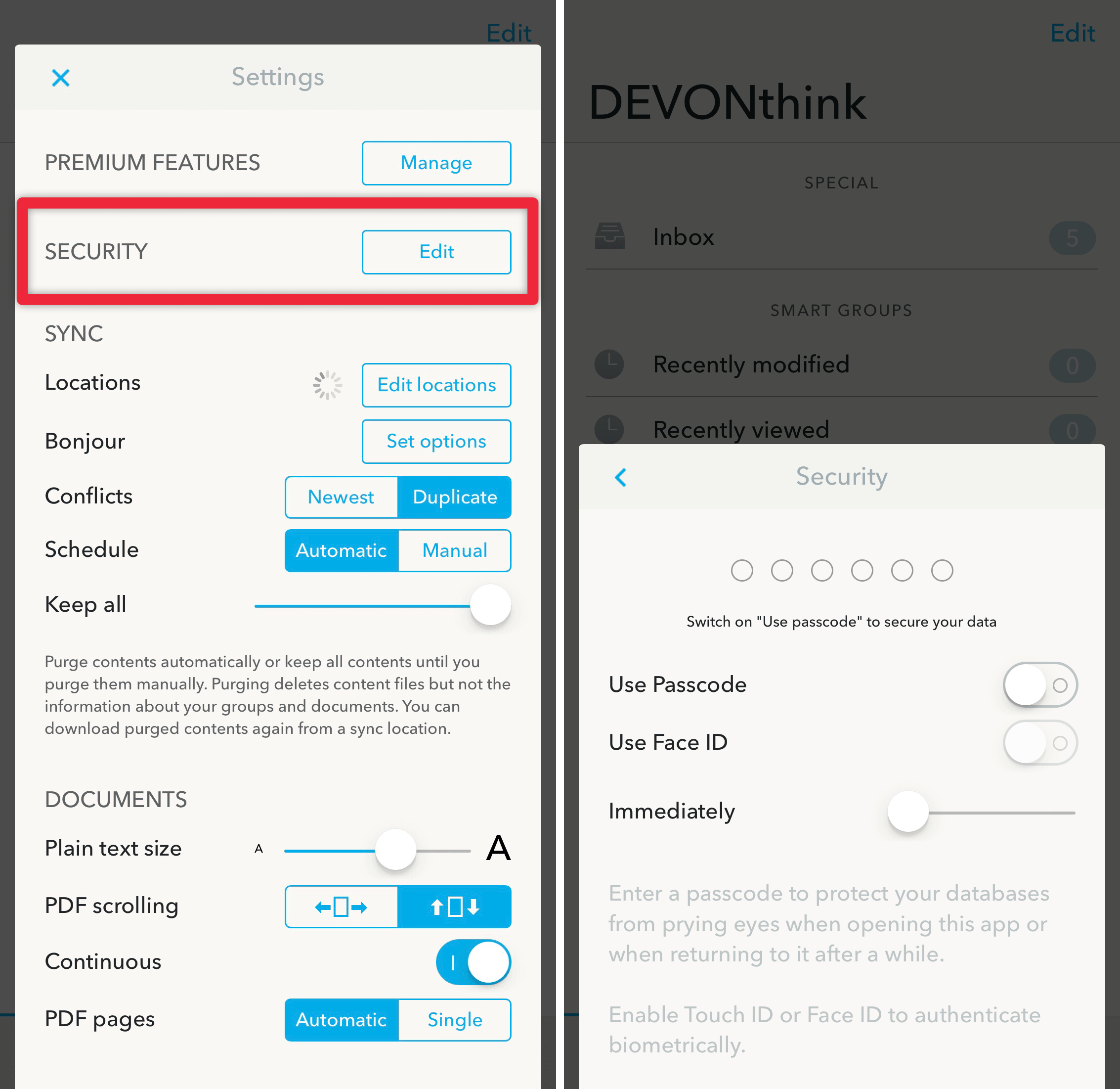 可以通过密码与 Touch/Face ID 保护 DEVONthink 中的内容;