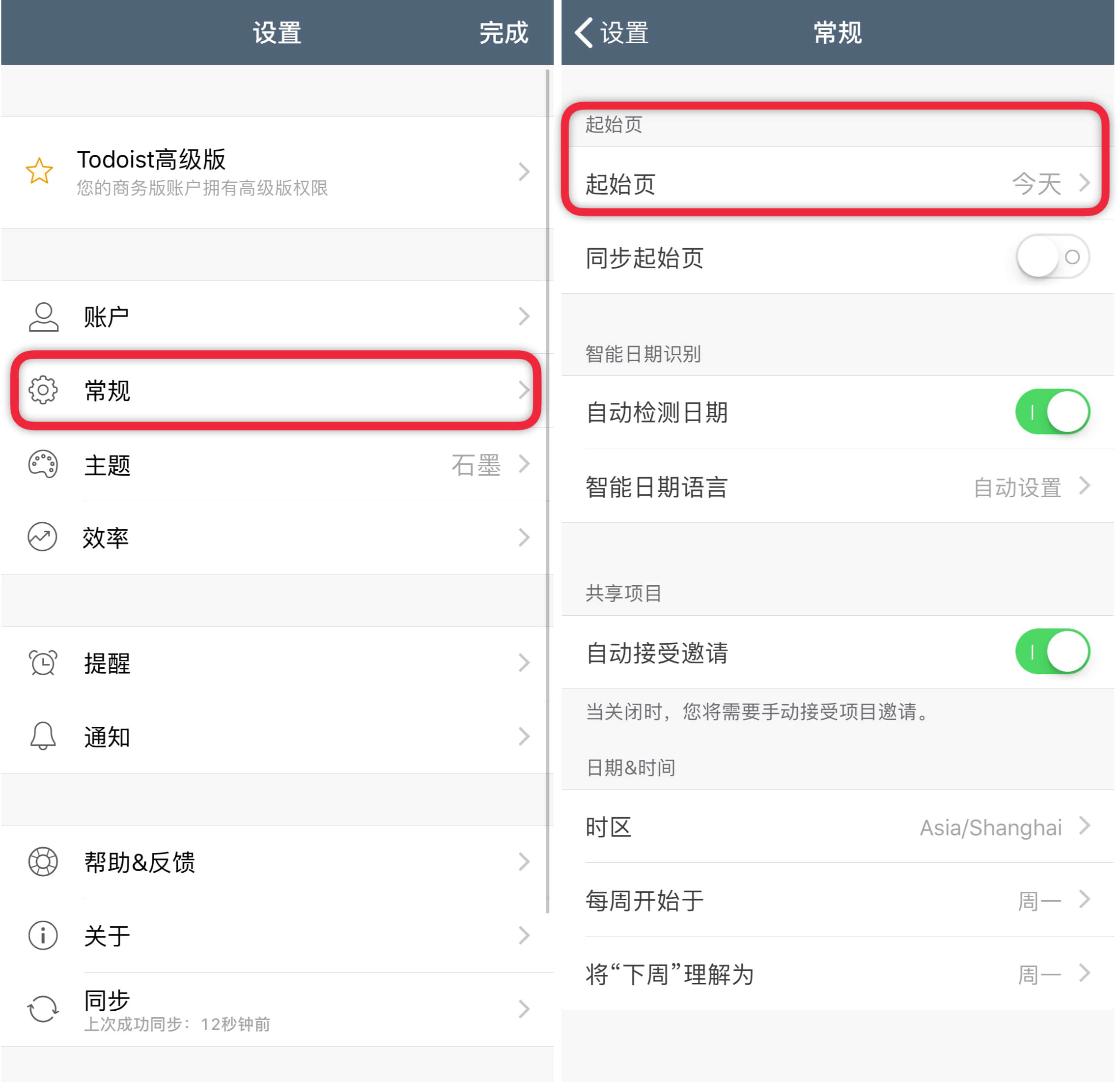 在此之前,Todoist 的默认启动页是「今天」这个视图,而现在使用者可以在「设置 – 常规 – 起始页」这个界面选择自己想要的启动页: