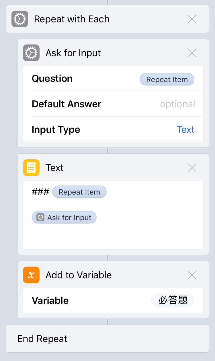 这个思路我最早是在 Hum 写的《Workflow 思路教程》里看到的,当时看到就觉得很有意思,不仅可以节省步骤,还间接解决了 Workflow 拖动效率低下的问题,一举两得。 接下来我用到了「Repeat with Each」,也就是对列表的每一个问题都进行回答。「Ask for Input - Question」里则用了 Workflow 自带的变量「Repeat Item」,每次都会自动将当前循环过程中的问题名字填进去,不需要我手动填写。