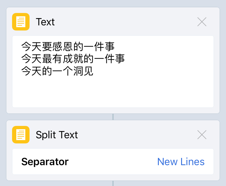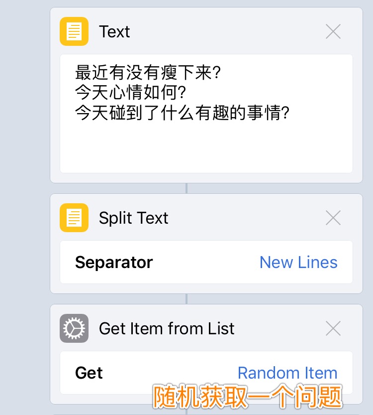 另一种思路是用「Split Text」来制作列表,也就是把所有要回答的问题都写进「Text」里,然后用「Split Text」分成多个,就可以得到一个列表。