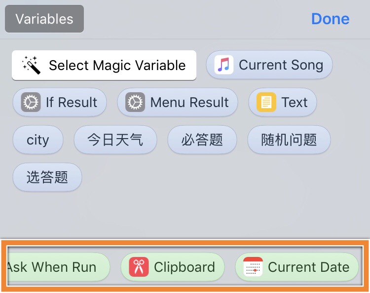 Workflow 自带的变量,包括「输入、剪贴板、日期」等