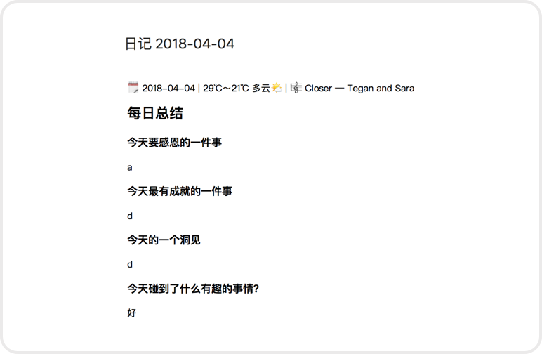 首先,日记前面要包括当前的日期和外面天气,后面是 Apple Music 正在播放的歌曲。