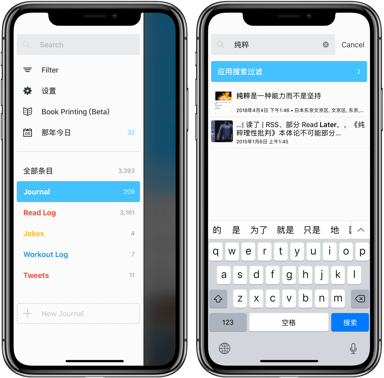 但其实在这次更新里,Day One 把切换日记本的形式改为了抽屉式的侧边栏,还在该界面的顶部增加了搜索框: