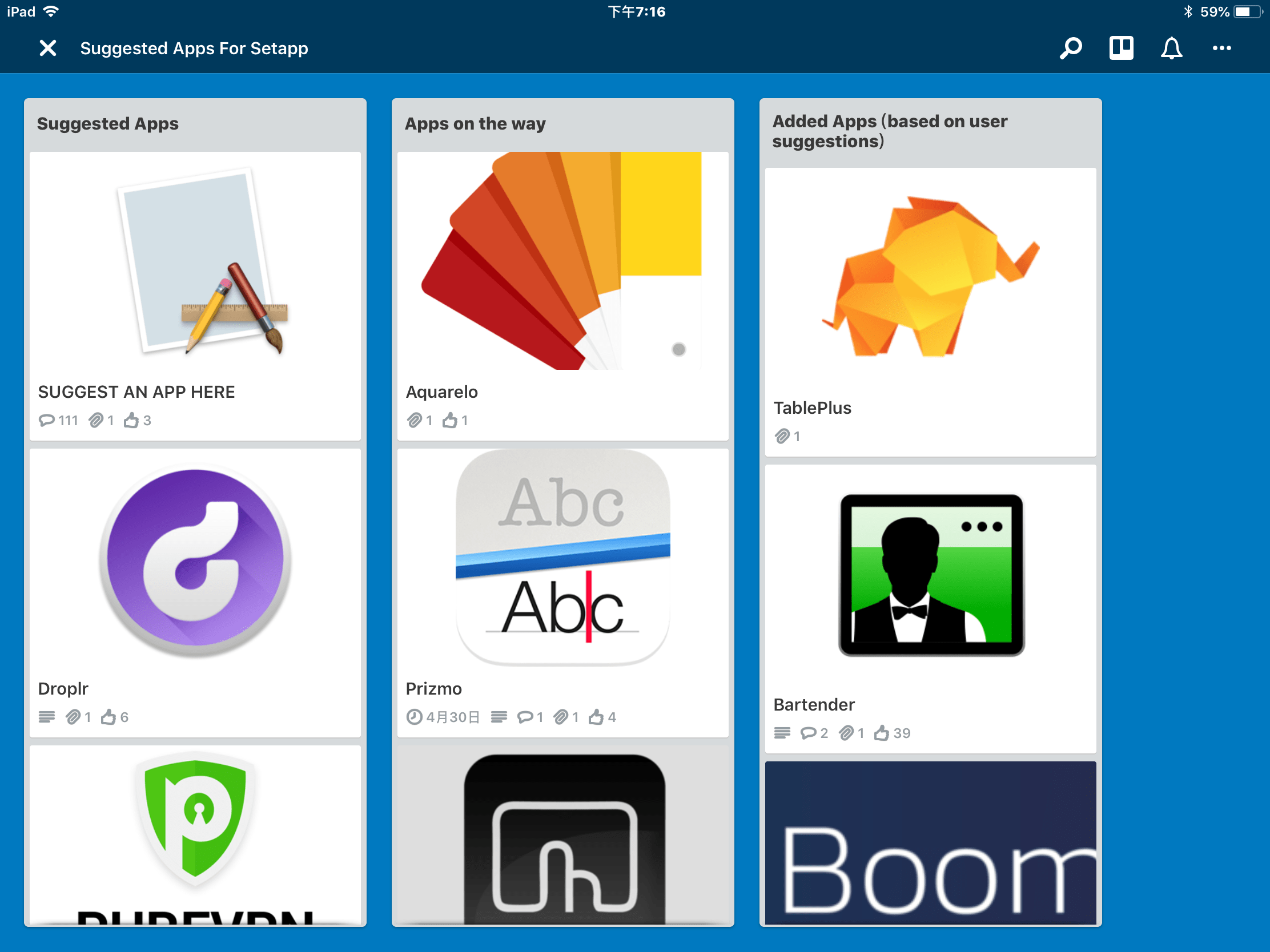 同时我个人发现了一个似乎是 Setapp 上架 App 意向与排期的 Trello 看板,里面包含了 「Sugfested App」、「Apps on the way」、「Added Apps」 这三个看板: 买软件的时候留心一下 「App on the way」 应该可以不花冤枉钱。