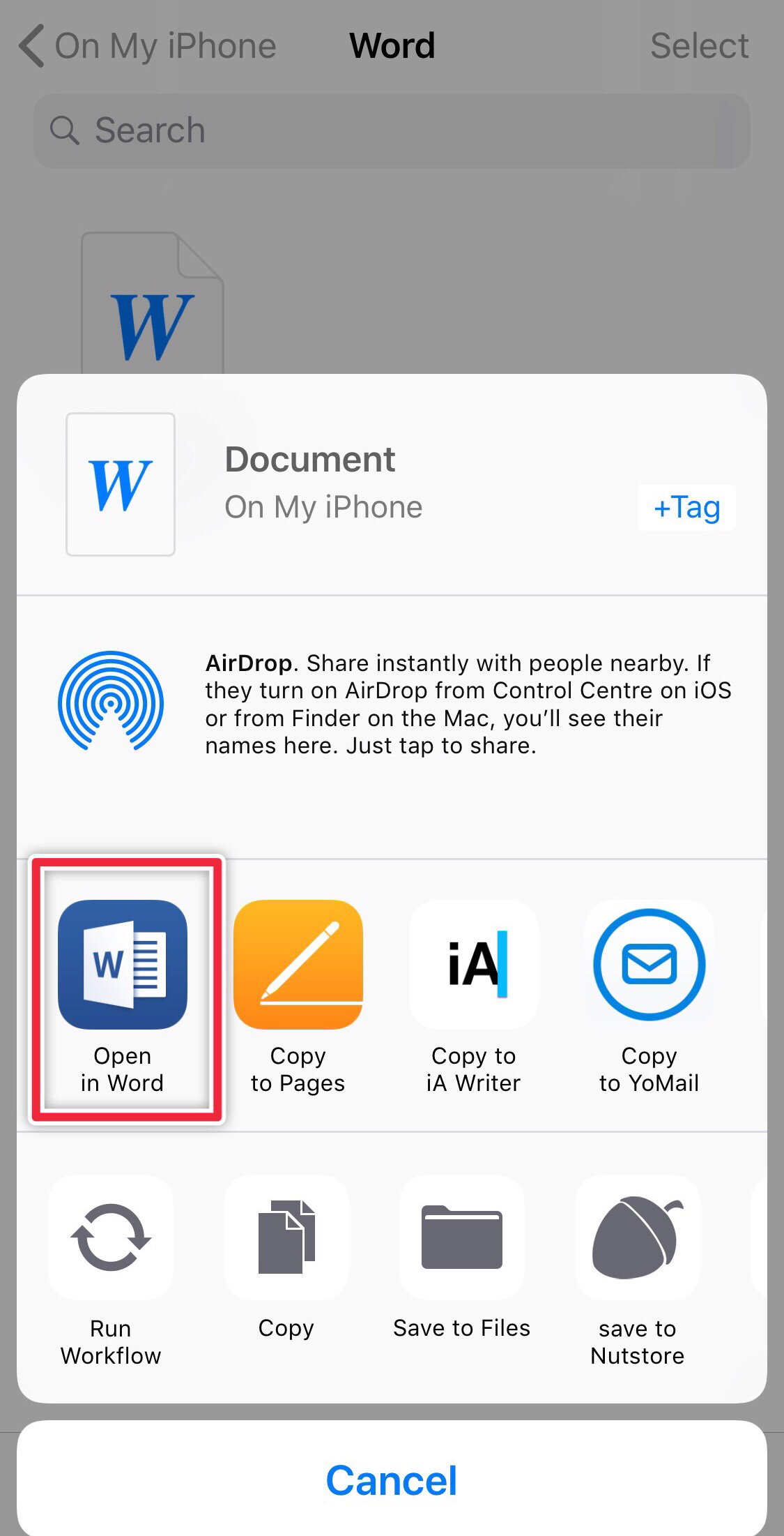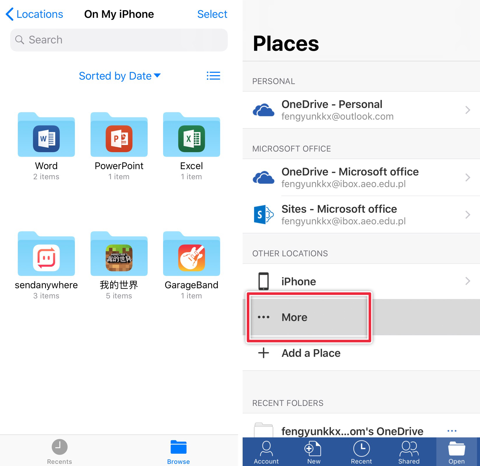在本次更新之前,要打开「文件」中的 Office 系列文档,需要先打开「文件」,进行分享,然后选择「在 Word 中打开」。Word 中只提供 OneDrive 和 Dropbox 等网络存储服务,无法打开「文件」中的文档的。
