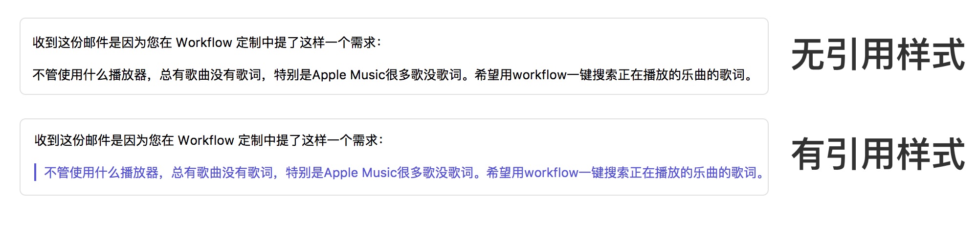 你会注意到 TextExpander 的剪贴板参数 %clipboard 后面还跟了一个 %|,这个符号的作用是将光标定位到这里,目的是让我完整输入模板后,对这段文字加一个引用的样式(快捷键是 ⌘Command-'),效果如下图: