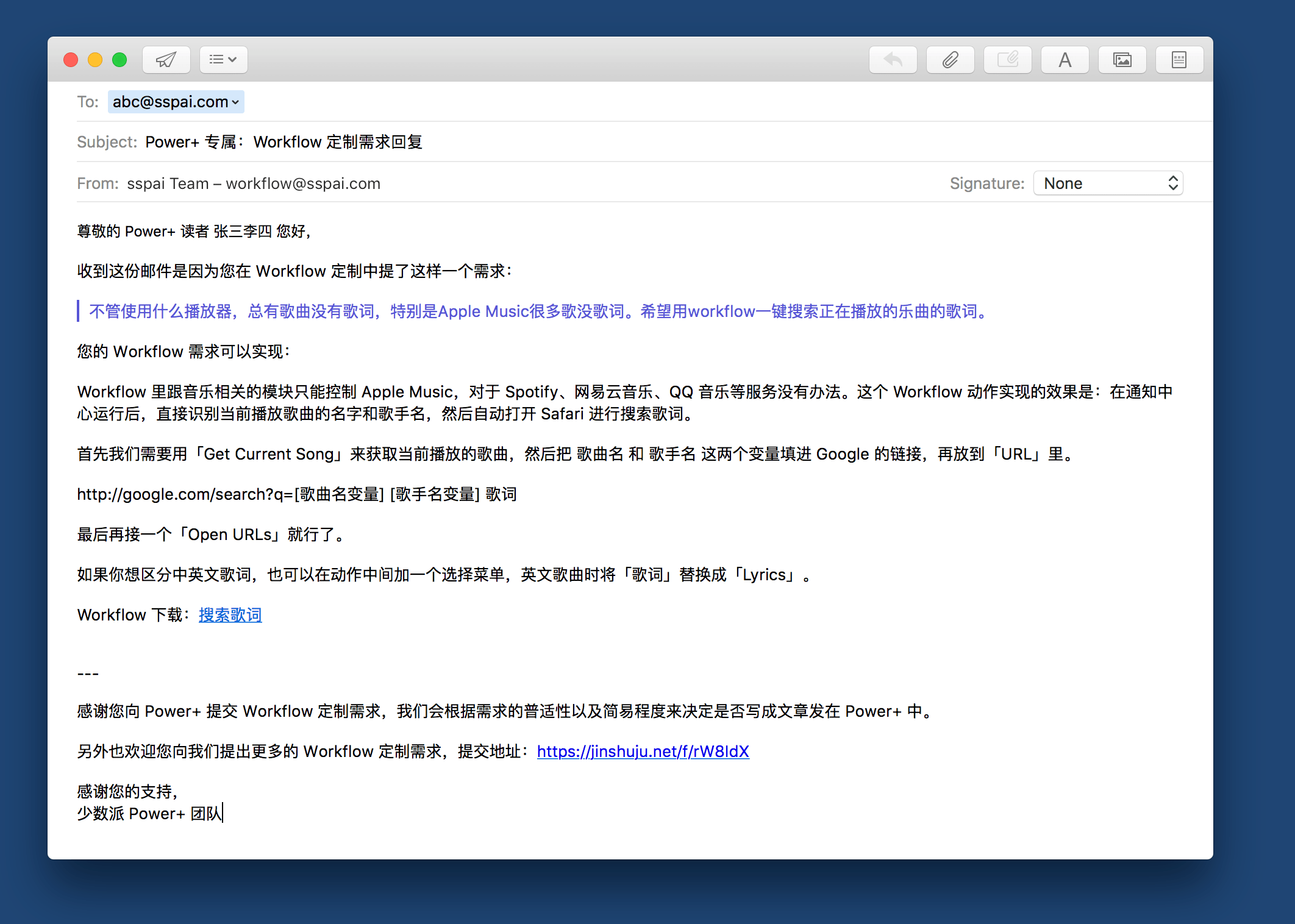 最近我们调整了 Workflow 定制栏目的回复方式,让每一位提交需求的读者都能得到回复,不管需求是否能实现,因此我自己也产生了大量的邮件发送需求。这些邮件有以下两个特点: 数量多;