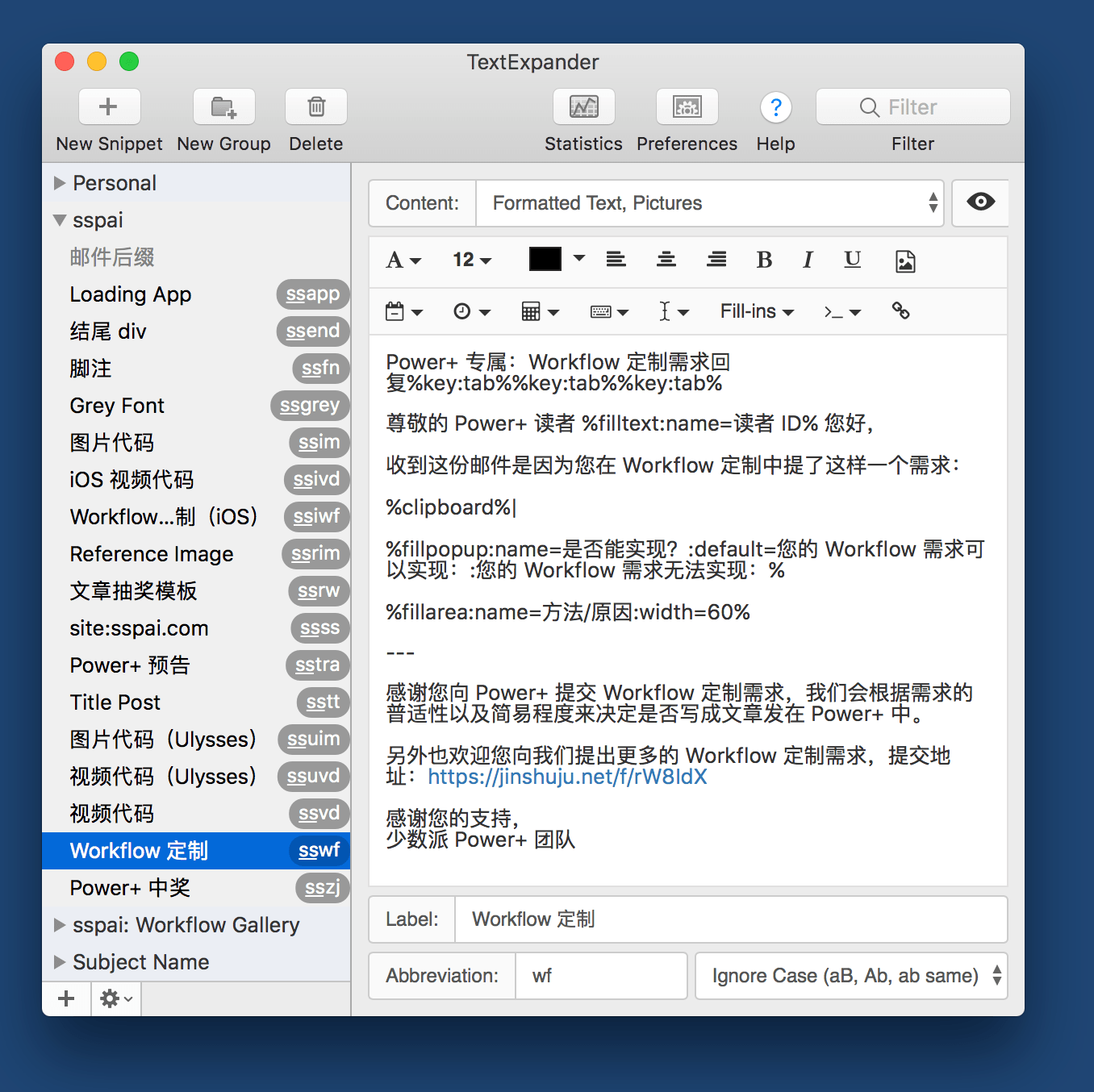 结尾部分基本是固定内容,其中因为需要提到 Workflow 定制的提交链接,所以我特地将 TextExpander 模板设为富文本,这样在输出到邮件中时读者也能方便点击。