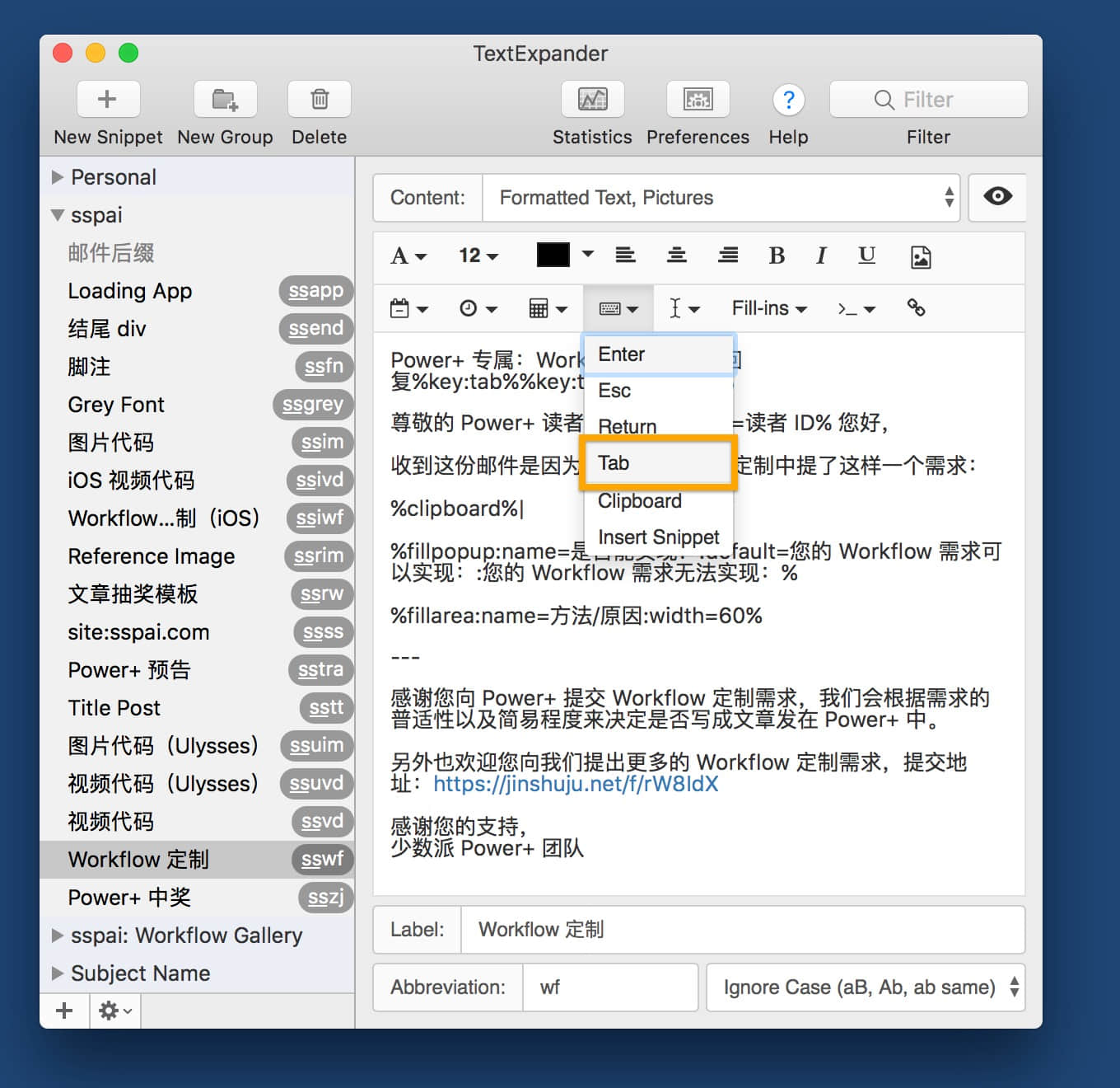 需要注意的是,在邮件客户端中(比如 macOS 自带),主题和正文不在同一个输入框中,因此通常填完主题之后,需要按下 Tab 键进行切换。这里就要用到 TextExpander 的特殊按键功能,通过工具栏上的「键盘图标」进行添加,选择「Tab」即可: