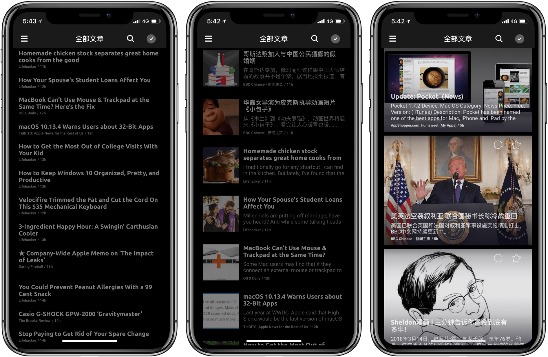 @Hum:Inoreader 这次更新用一个词来概括就是「更现代」了。最明显的一点是它提供了 3 种视图:
